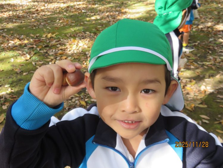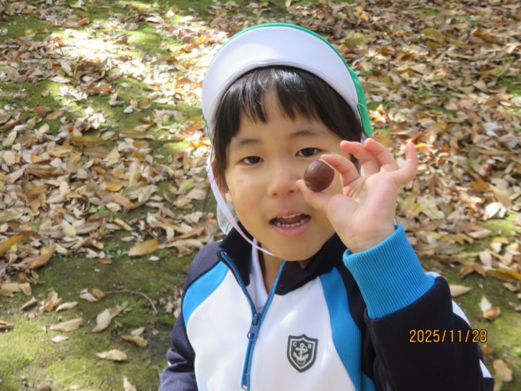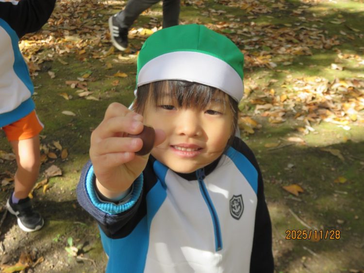 大きなどんぐり、まぁるいどんぐり、細長いどんぐり・・・といろいろな形のどんぐりを袋いっぱいに集める子どもたち 🪵🍂