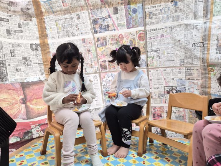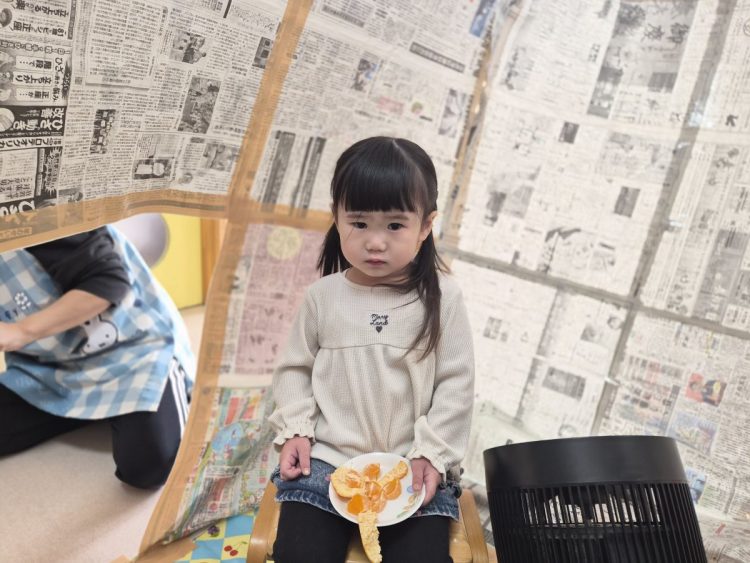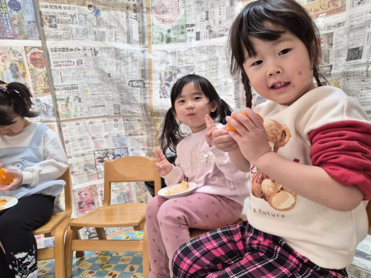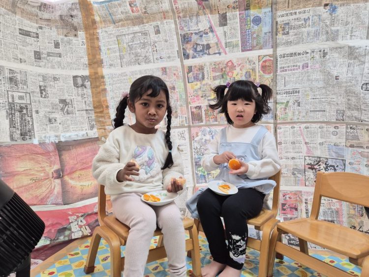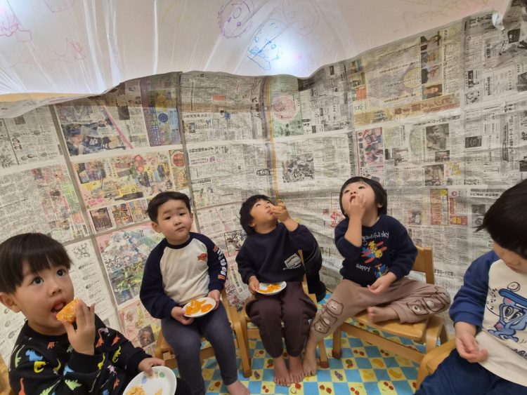 かまくらの中で、みんなでミカンを