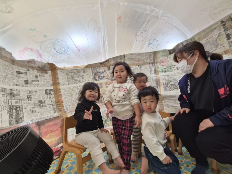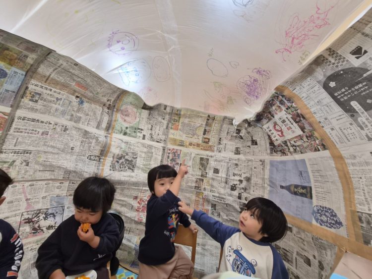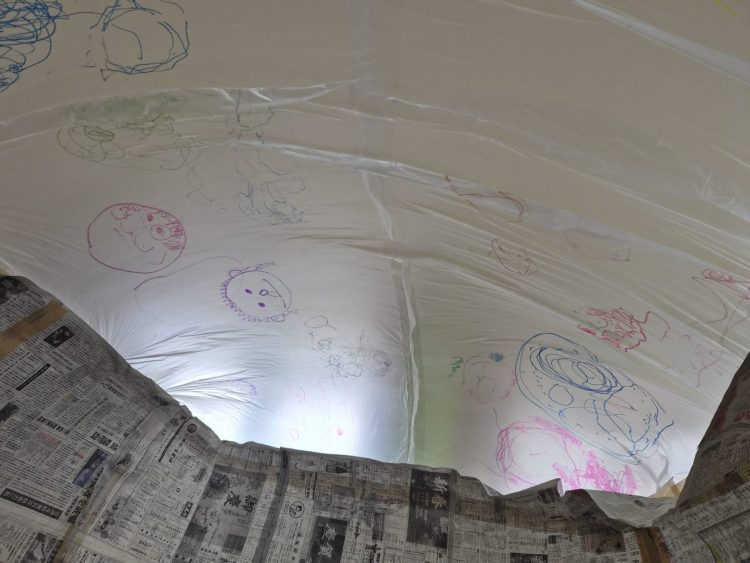 新聞とビニールで作った、エアドームを