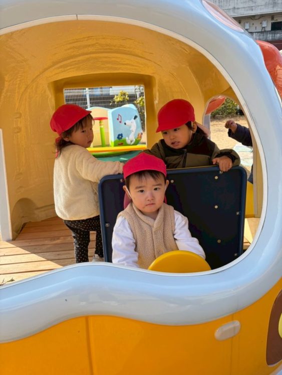 砂場横の車の遊具には、お客さんを乗せ