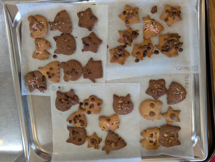 出来上がったクッキーは、給食室の先生にオーブンで焼いてもらいました。