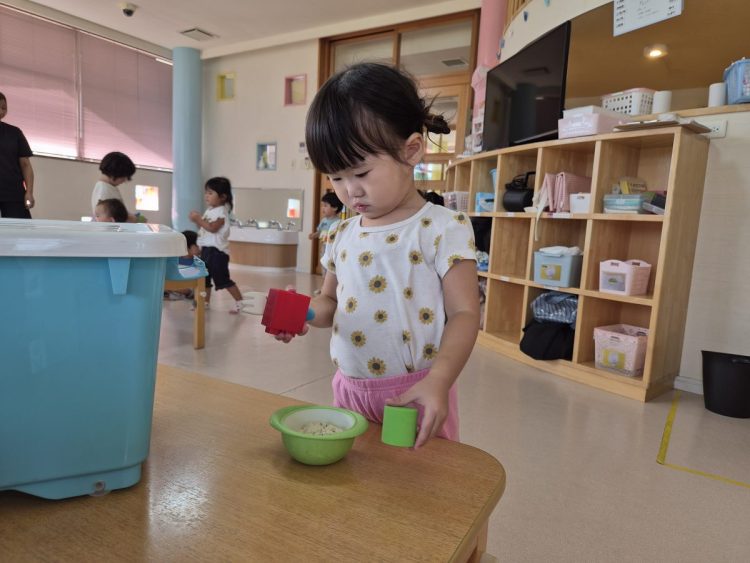 慣れてくると、れんげですくい、コップに入れてジュースをつくったり、おままごとを楽しんだりする姿が見られましたよ😉✨