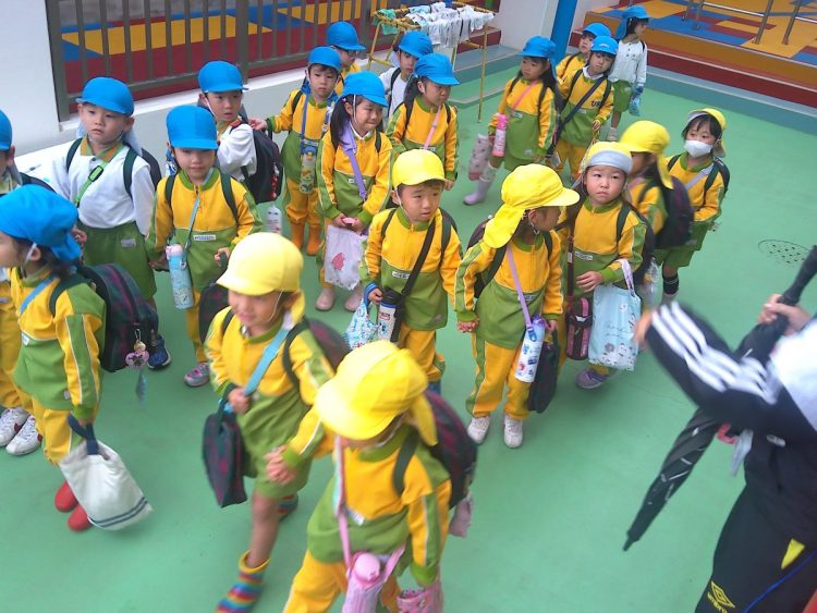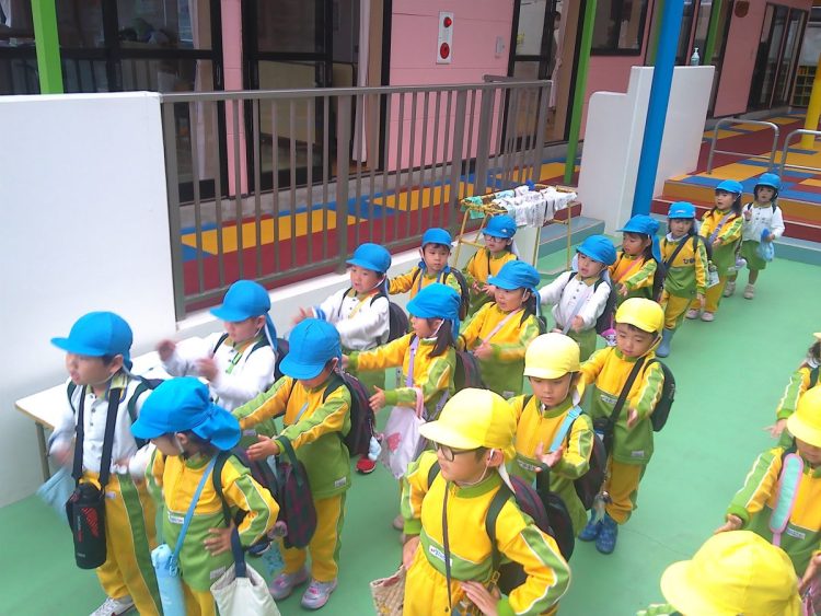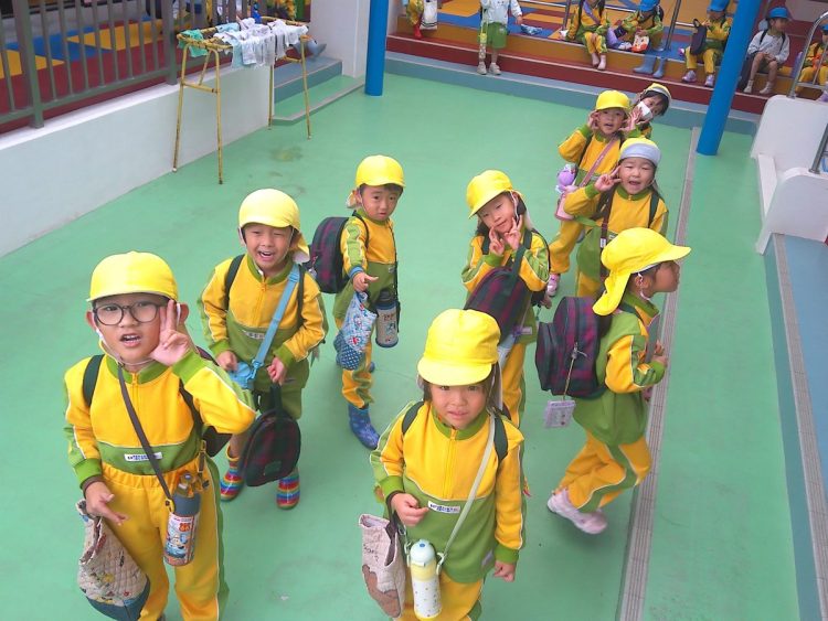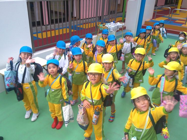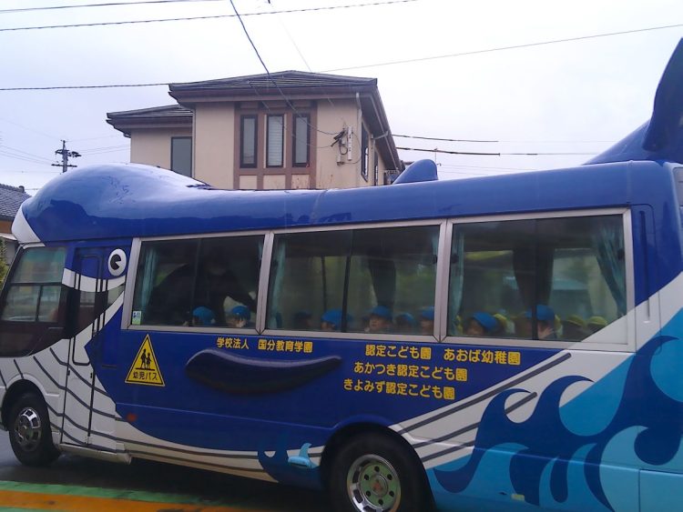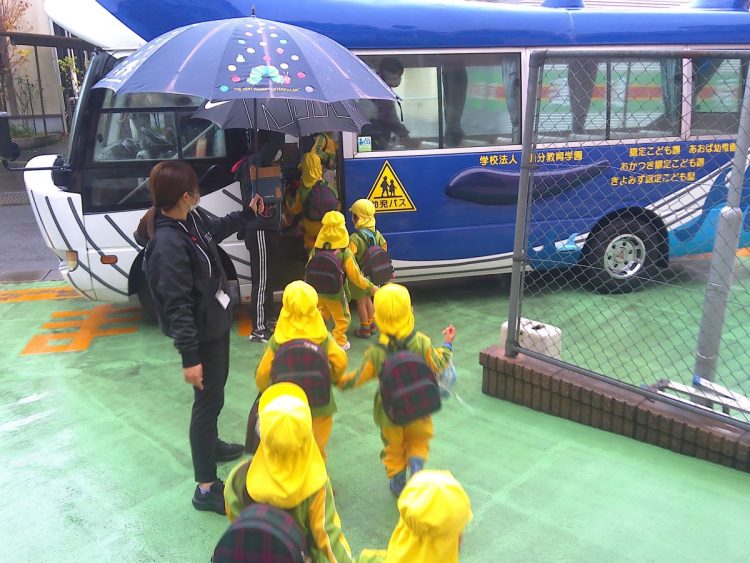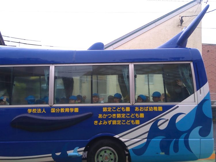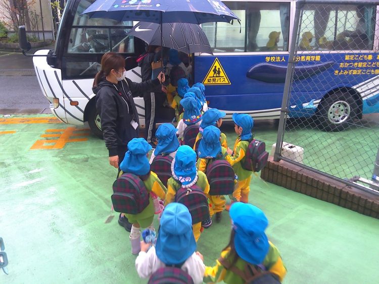 年中さんが「園外保育」で、くじらバスに乗って出発しました。高千穂牧場に行く予定でしたが、天気が悪いため空港で飛行機の離発着を見てから、サンあもりに向かうようです。サンあもりでは体育館などでボールなどを使って遊ぶようです。状況に応じて楽しんでほしいと思います。