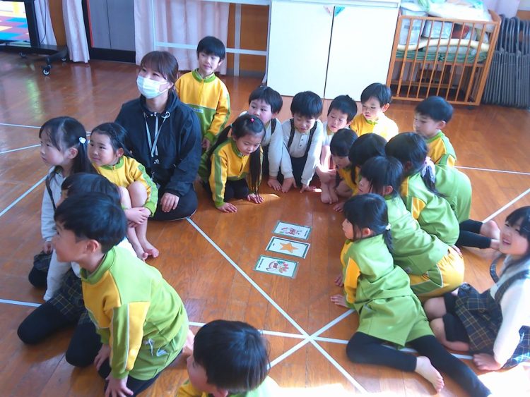 以上児園舎では、先月インフルエンザが多くて紹介できなかった11月生まれのお友達と、今月12月生まれのお友達の紹介や質問タイムがありました。最後に担任からプレゼントをもらい、みんなからハッピーバースデーの歌のプレゼントがありました。