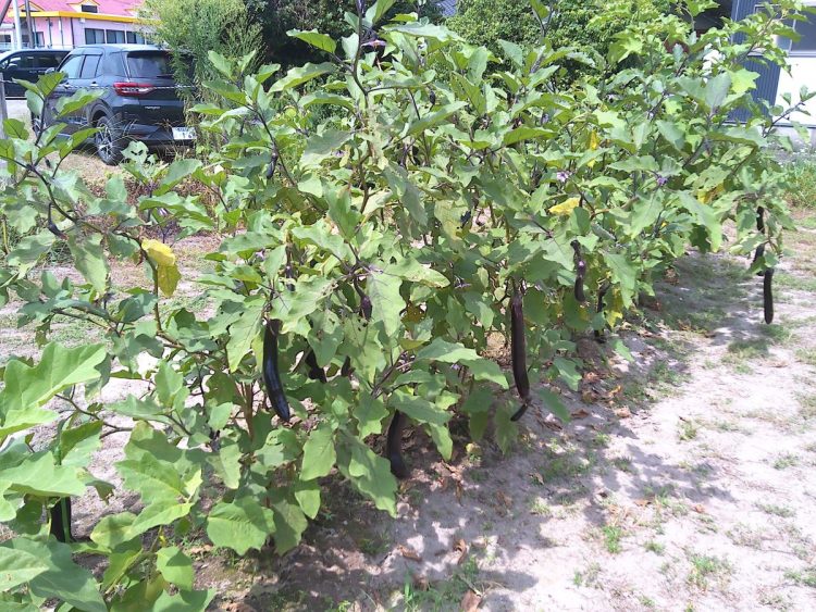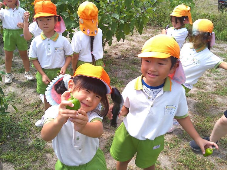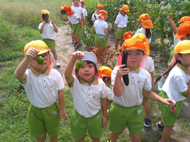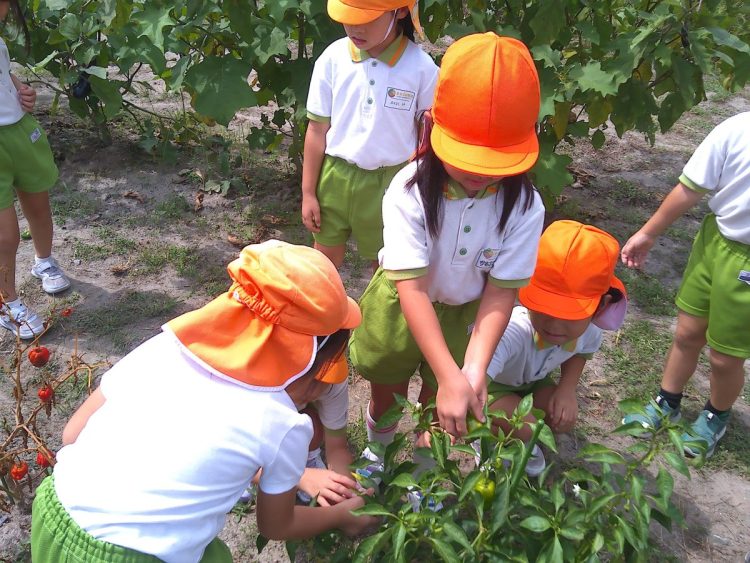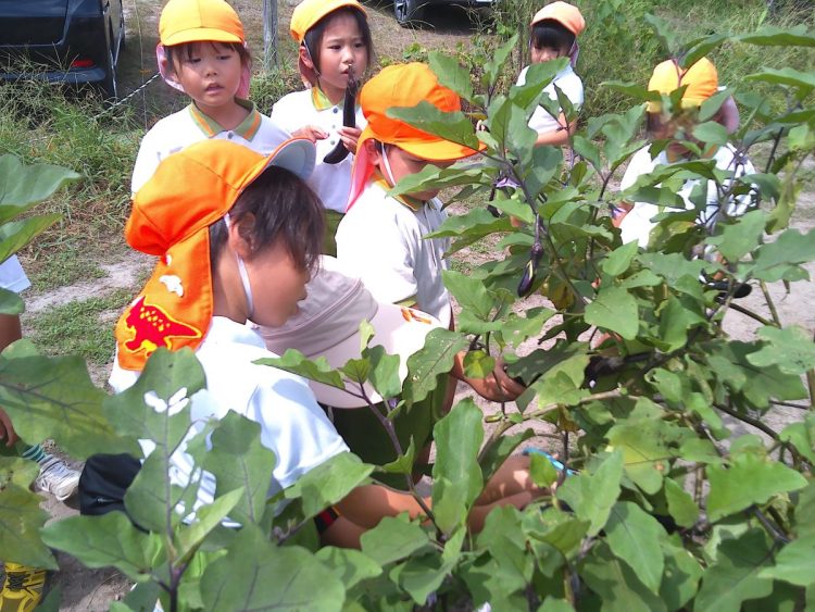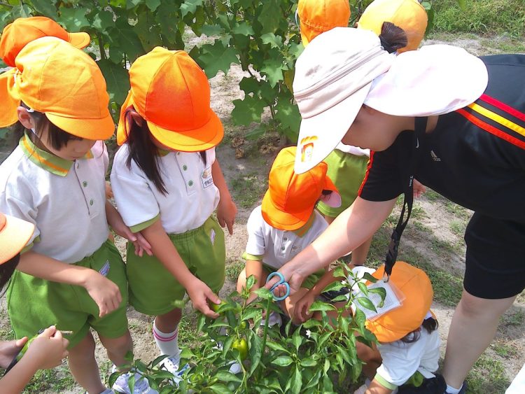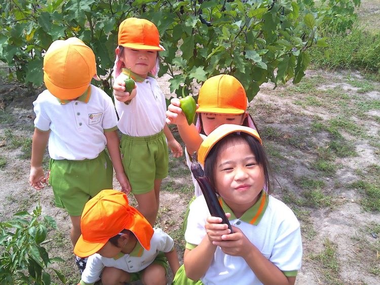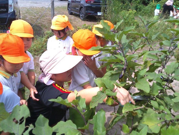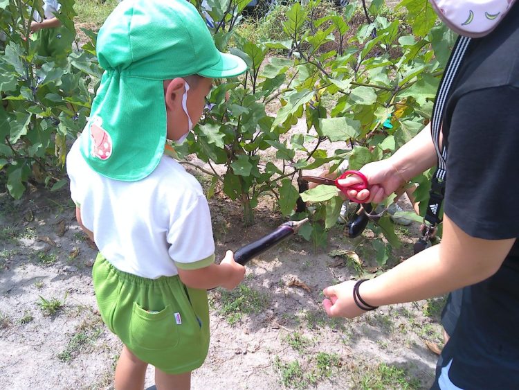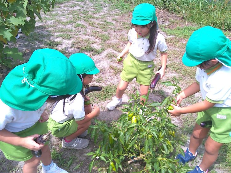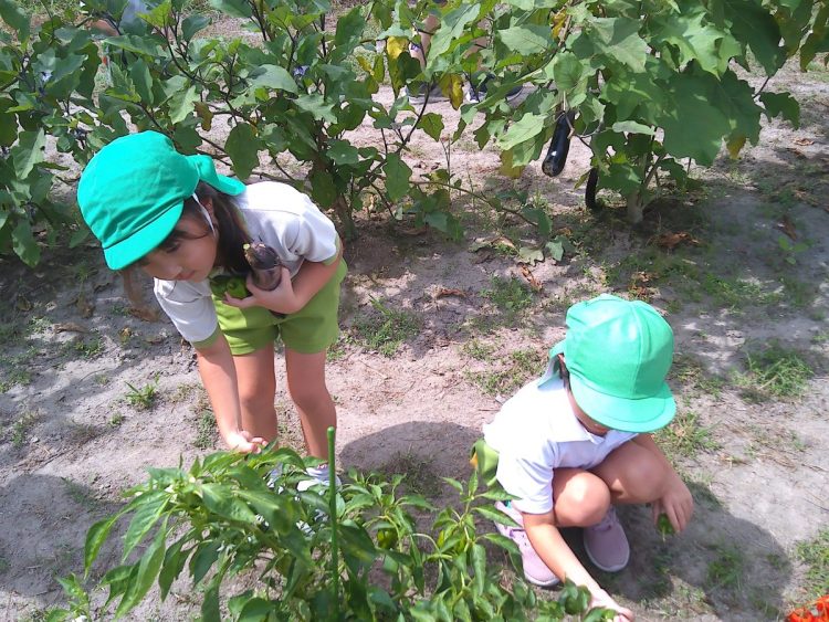 昨日の午後に、年長さんがなすびやピーマンの収穫を行いました。