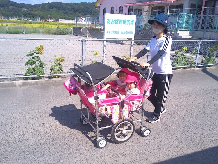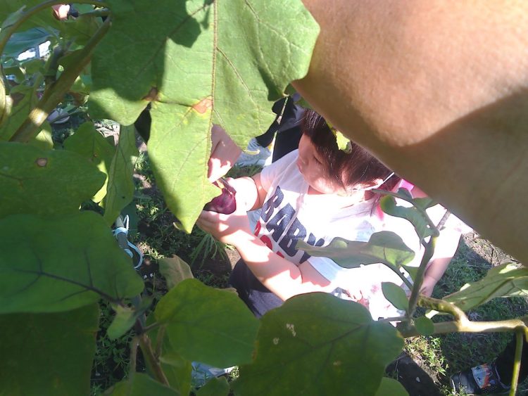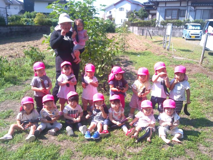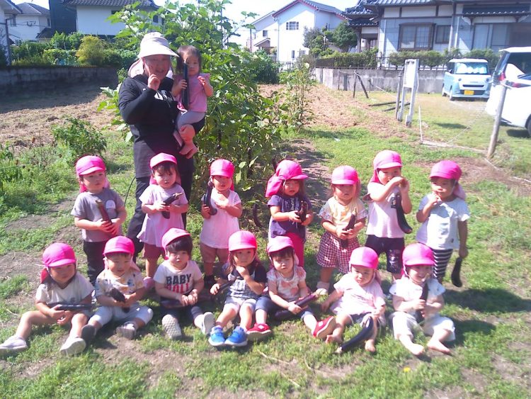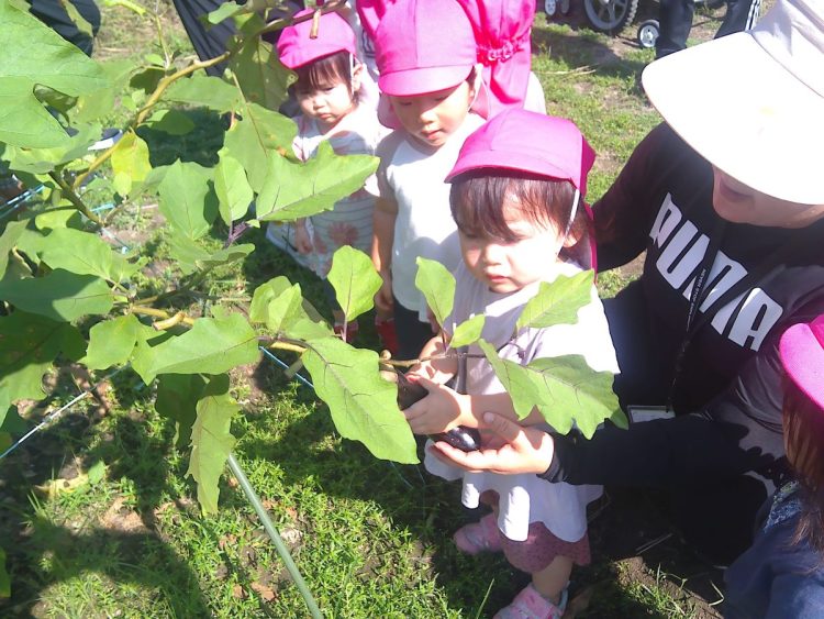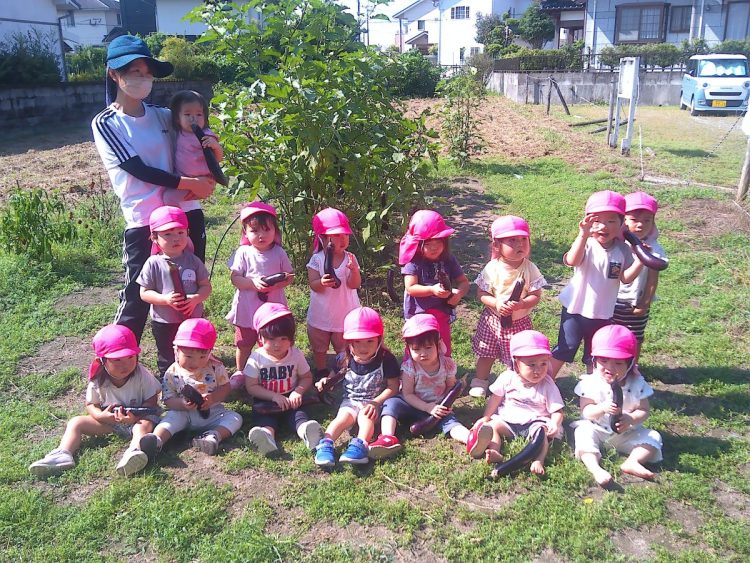 一昨日、りす組(1歳児)さんが、園舎周辺のお散歩を兼ねて野菜の収穫をしました。自分の顔よりも長く育ったナスを採っていました。お散歩と野菜の収穫、楽しく活動できていました。
