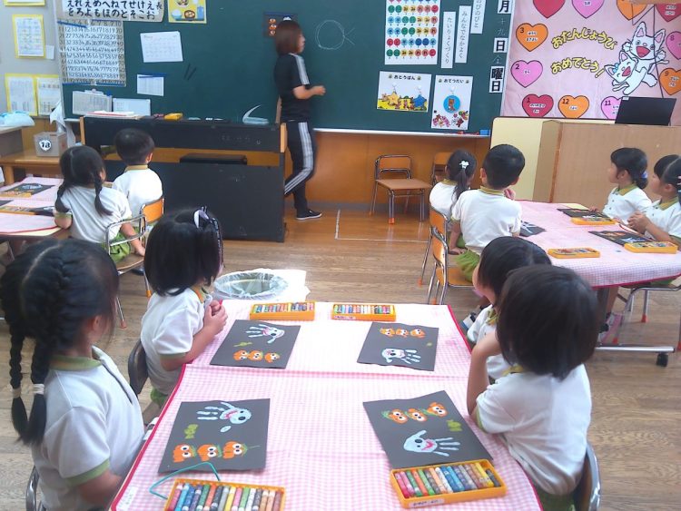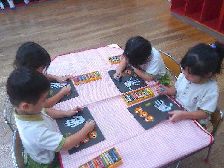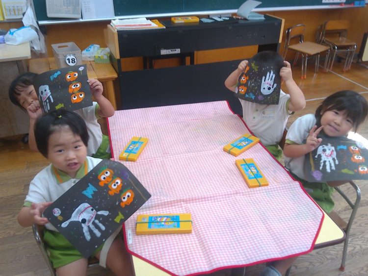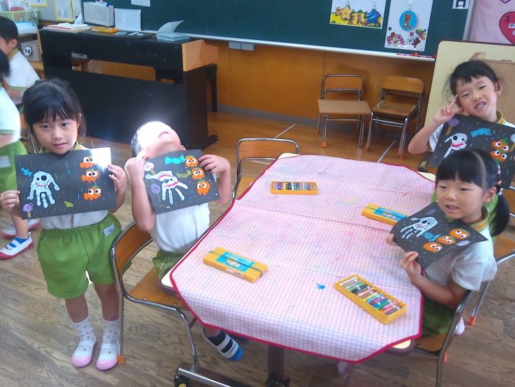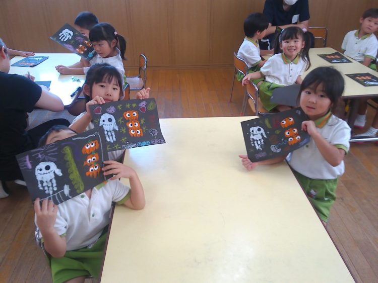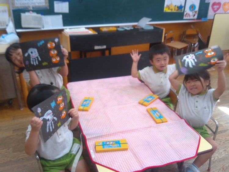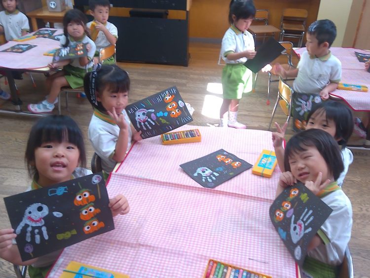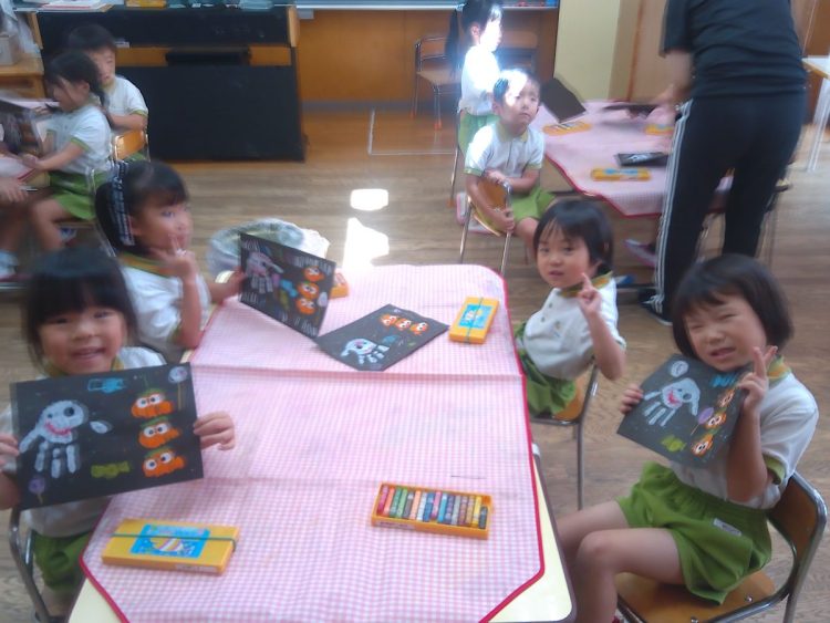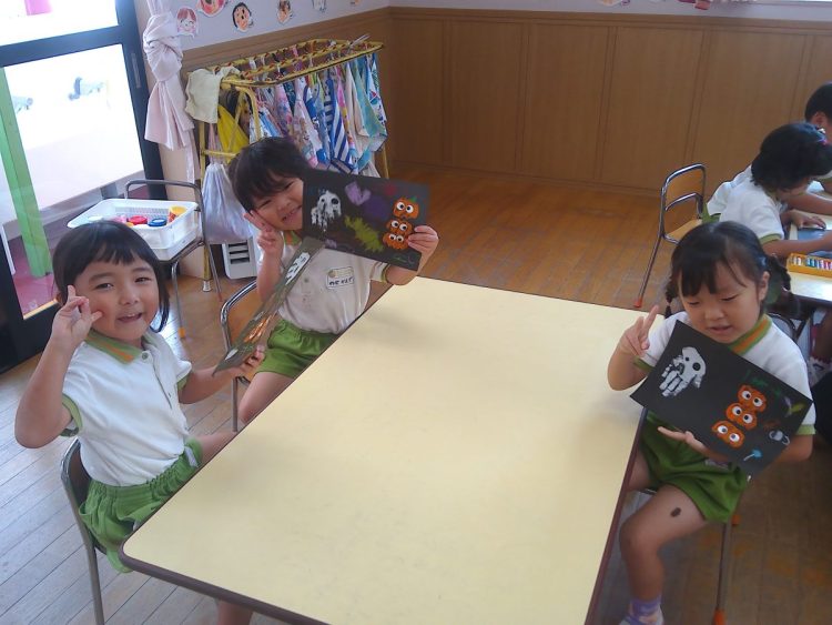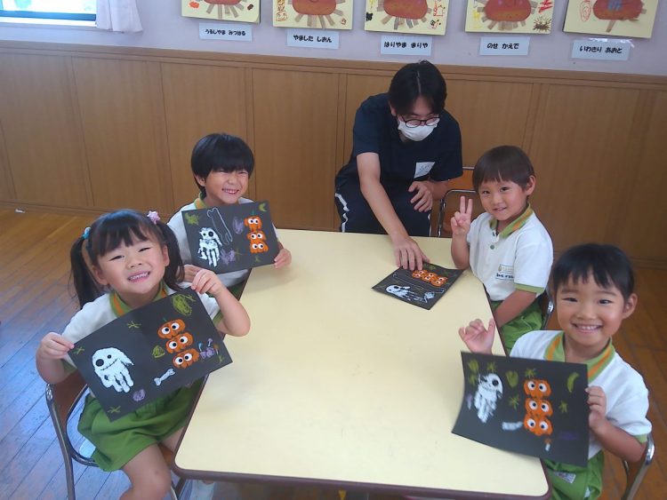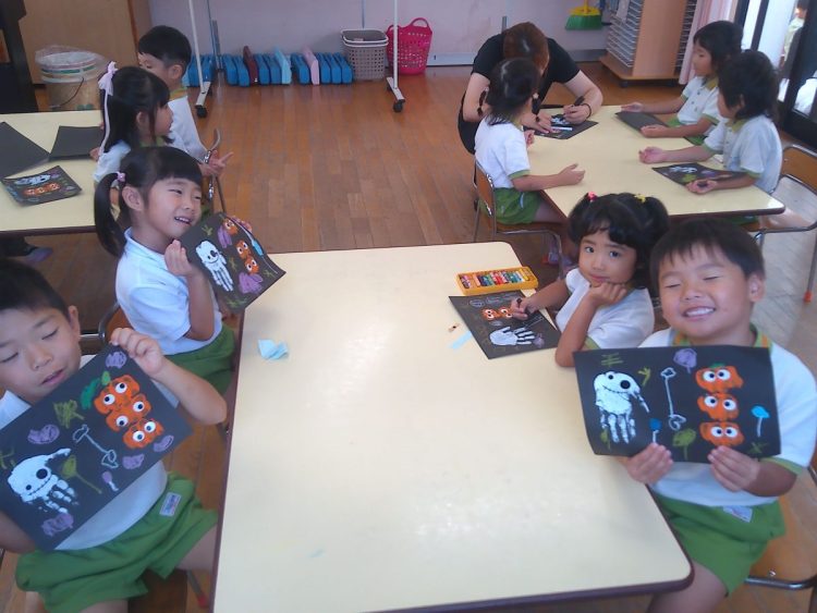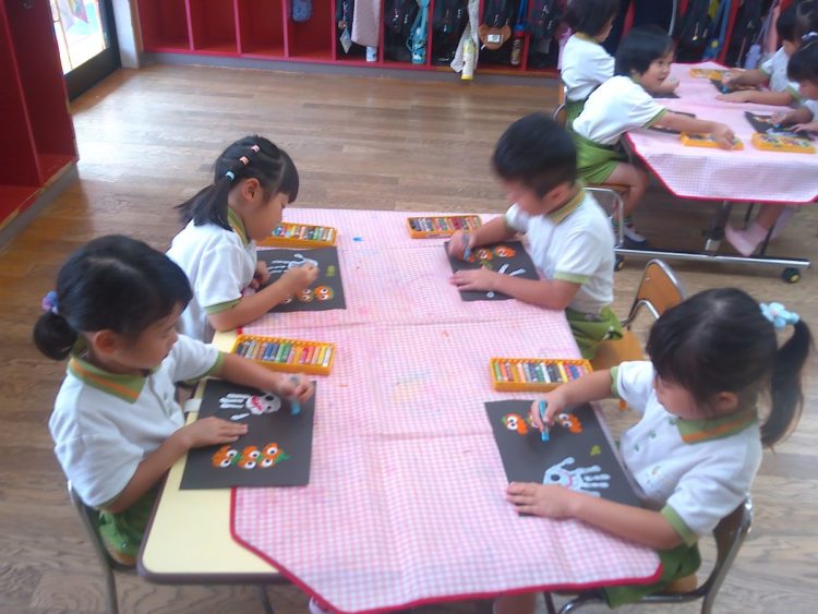 年中さんが、先日作った手形の作品に、さらにキャンデーの絵などを追加して季節の飾り物(ハロウィンの飾り物)作成に取り組んでいました。作品は26日(金)の参観日の際に、ぜひご覧ください。
