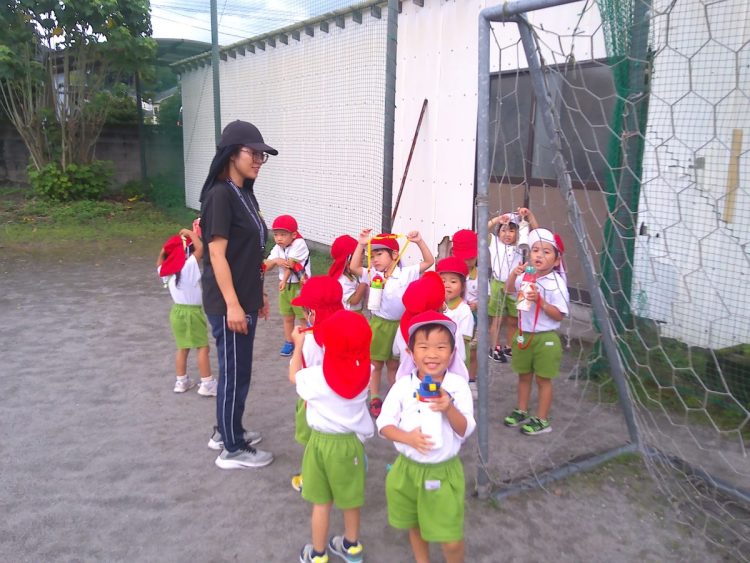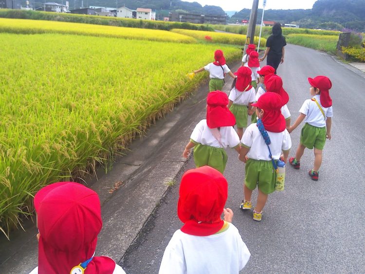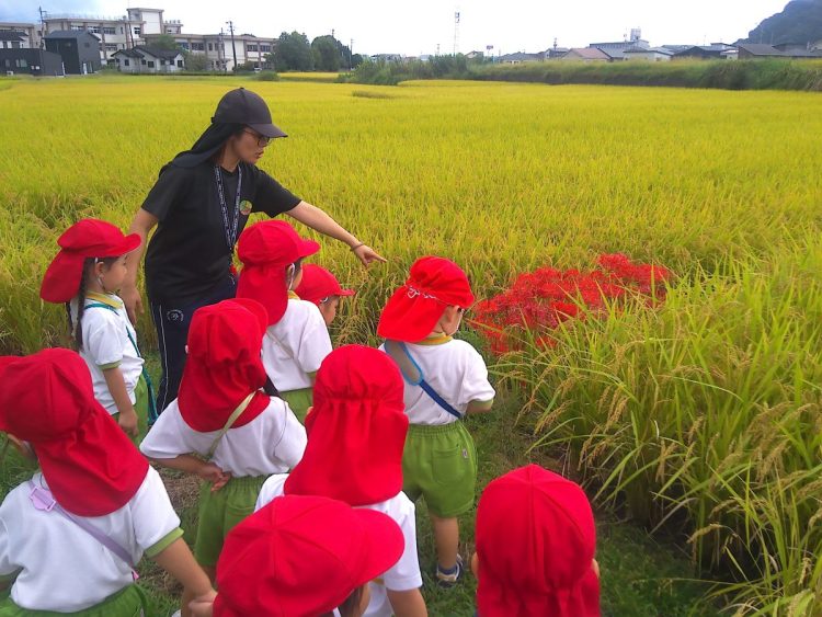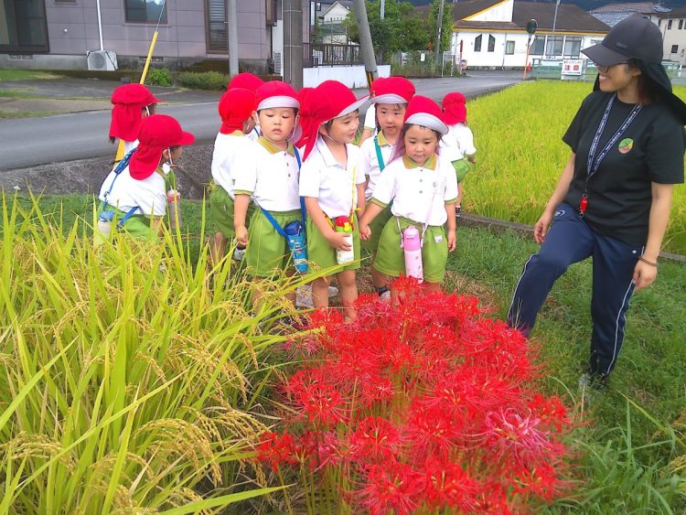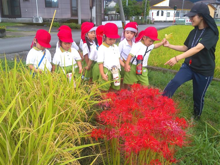 秋を見つけに行ったよ! 2025年9月30日 昨日、年少さん(つき組・にじ組)が、「秋を見つけよう」ということで、園の近くを探索していました。トンボを見つけたり、稲穂が大きく育っていたり、ヒガンバナが咲いていたりと、小さな秋を見つけていたようです。