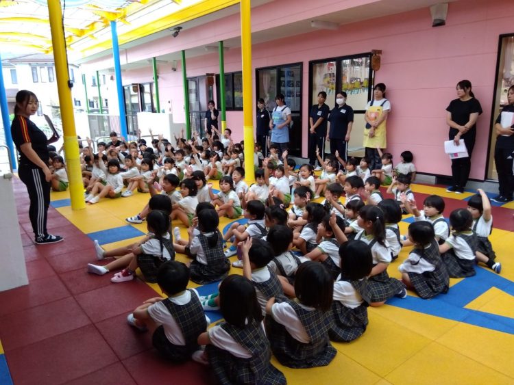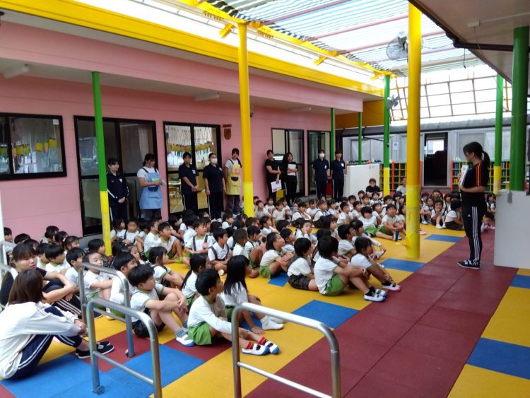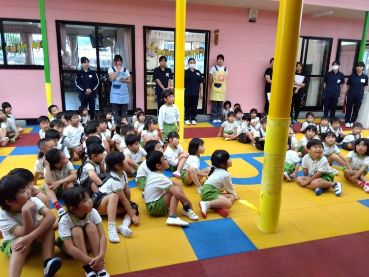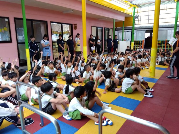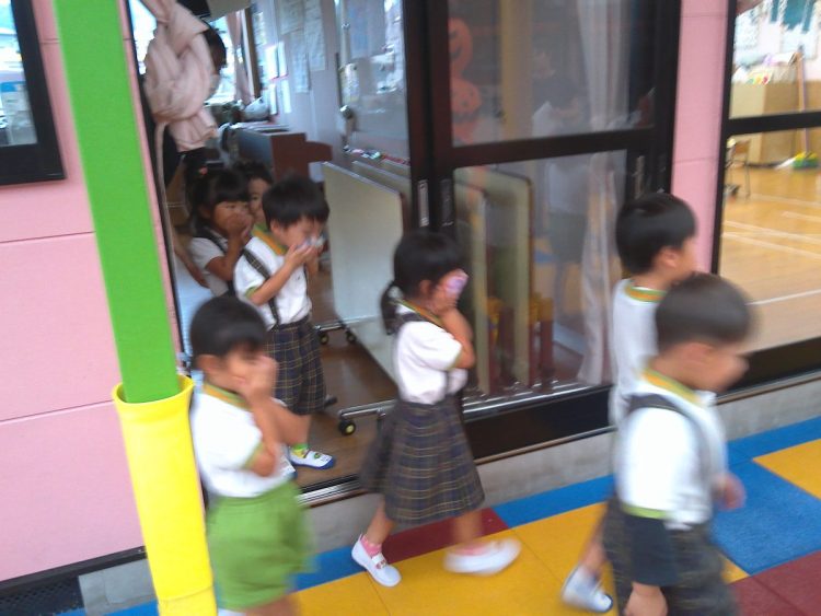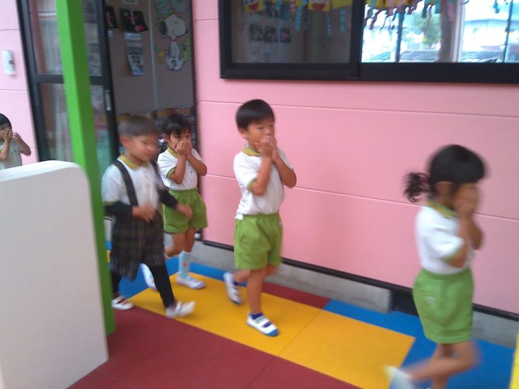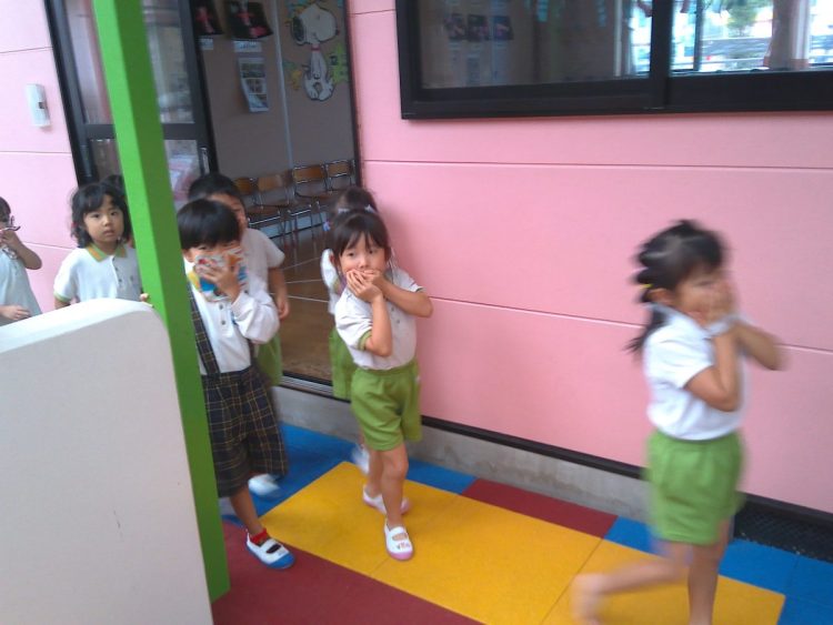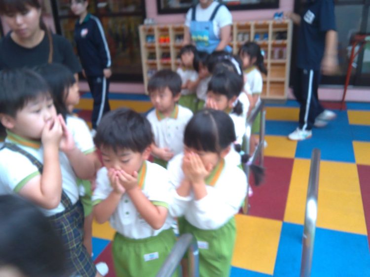昨日は一か月に一回実施している「避難訓練」の日でした。今回は、地震が起こり、火事が発生したという想定で行いました。毎月訓練を行っているせいか、子どもたちは静かにテラスに集合することができました。いつも話をしていますが、地震や火事はいつどこで発生するか分かりません。とにかく落ち着いて行動することが大事です。家庭でも話題にしてくださいね。