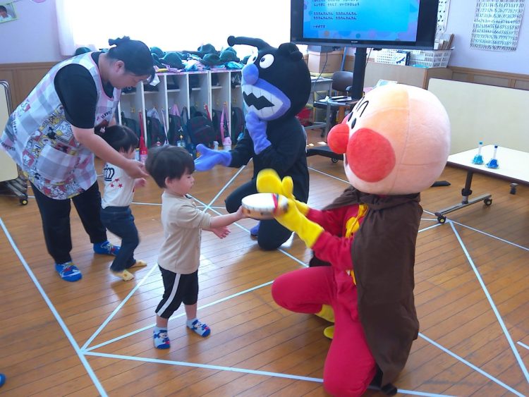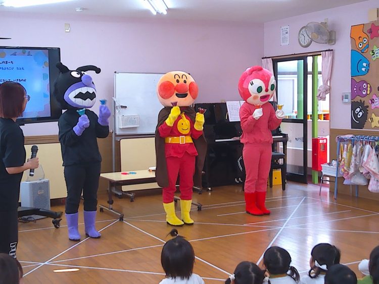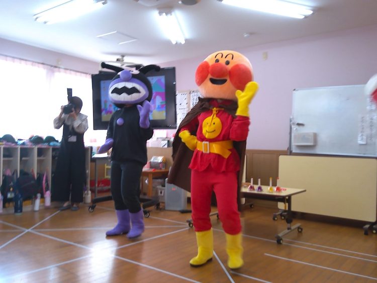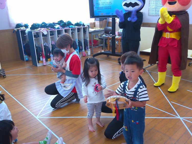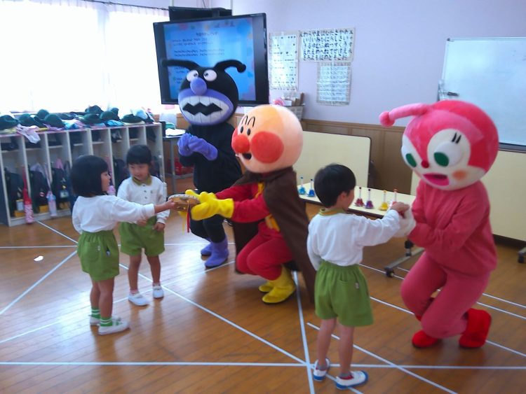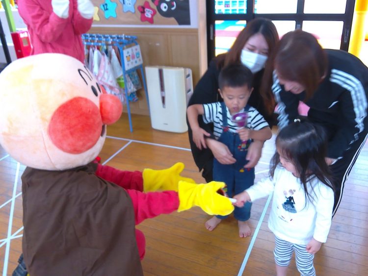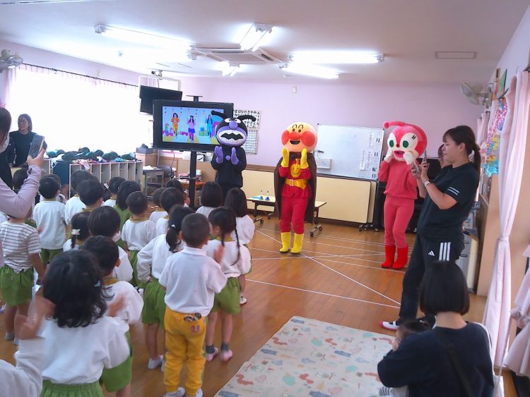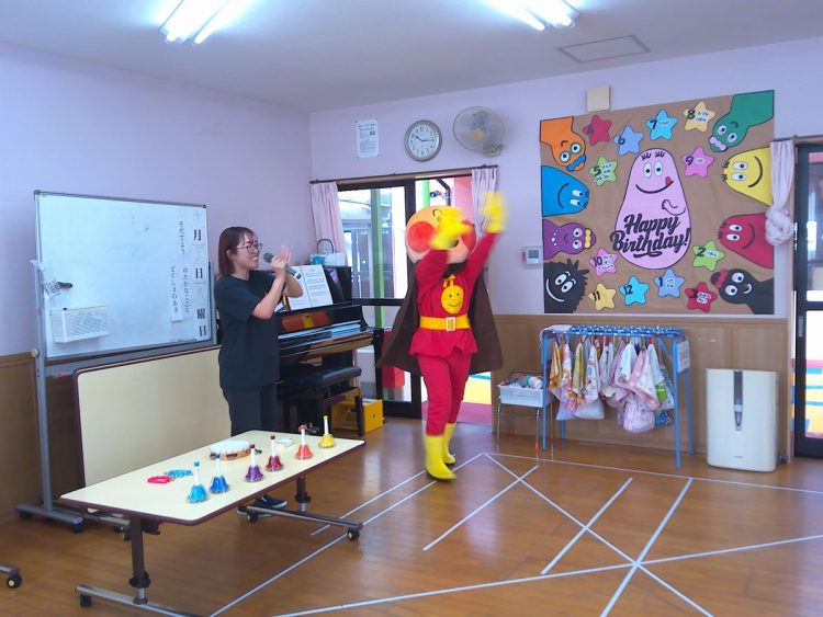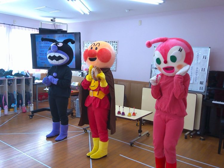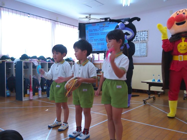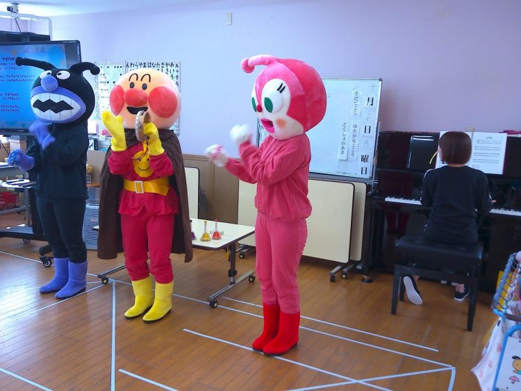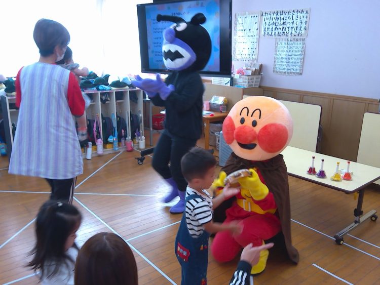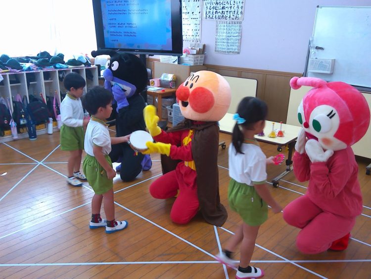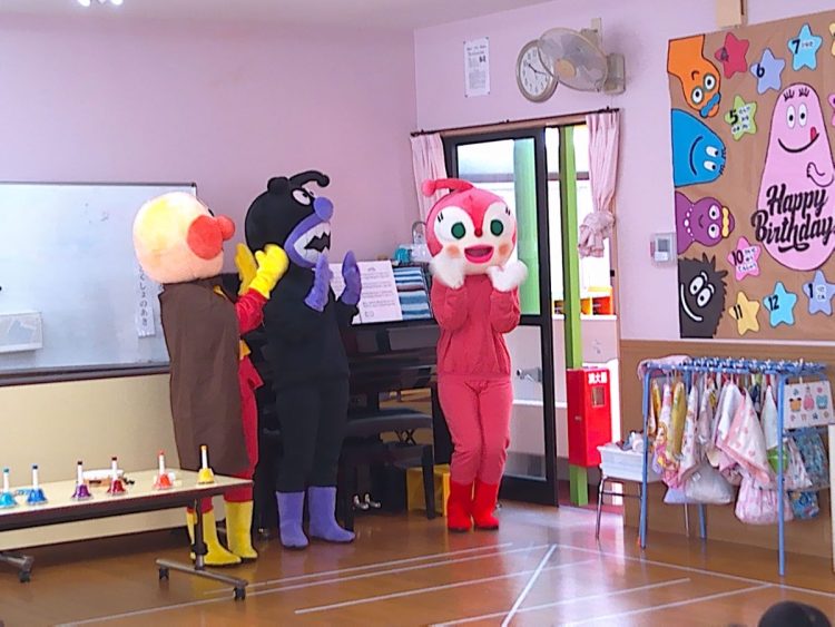 今日、アンパンマンとドキンちゃん、バイキンマンがあおば幼稚園にやってきました。アンパンマンたちは音楽のプレゼントとして、ハンドベルの演奏をしながらみんなで歌ったり、タンバリンなどを使って一緒に歌ったりして、みんなを楽しませてくれました。また、アンパンマン体操も一緒にしました。最後にクラスごとに記念撮影を行いました。来年もまた来てくれたらいいですね!