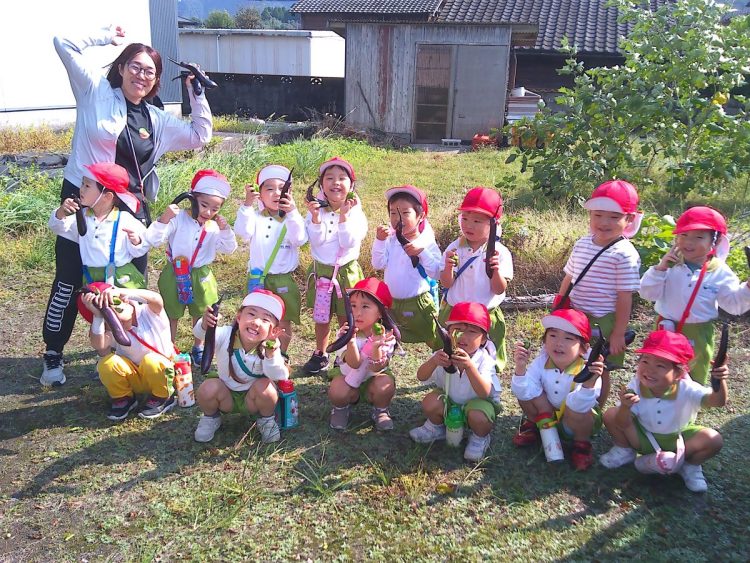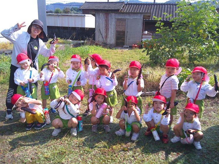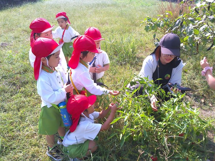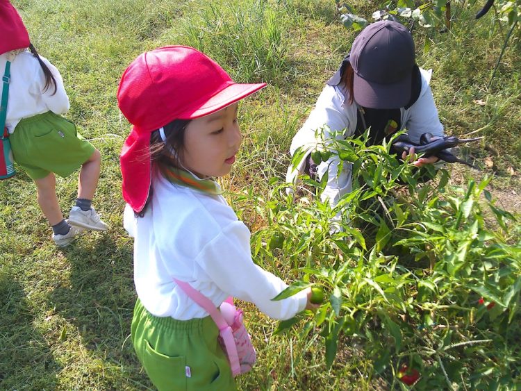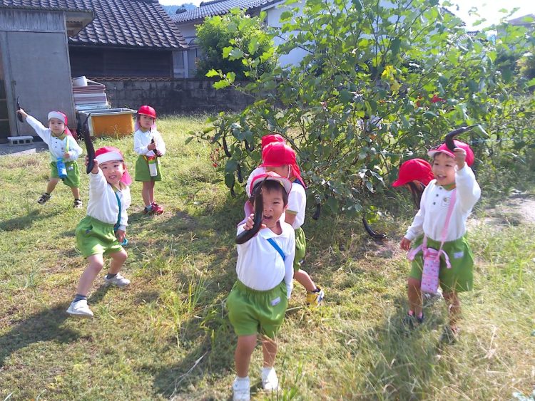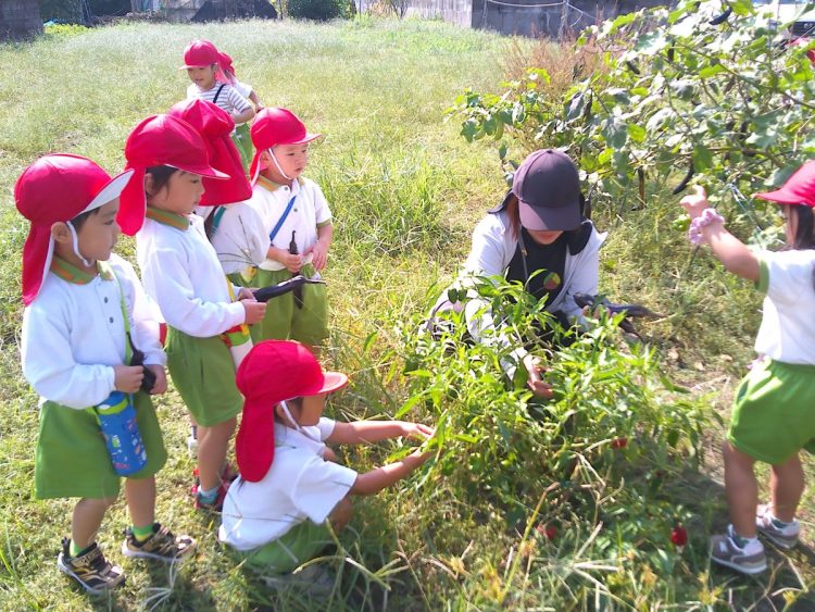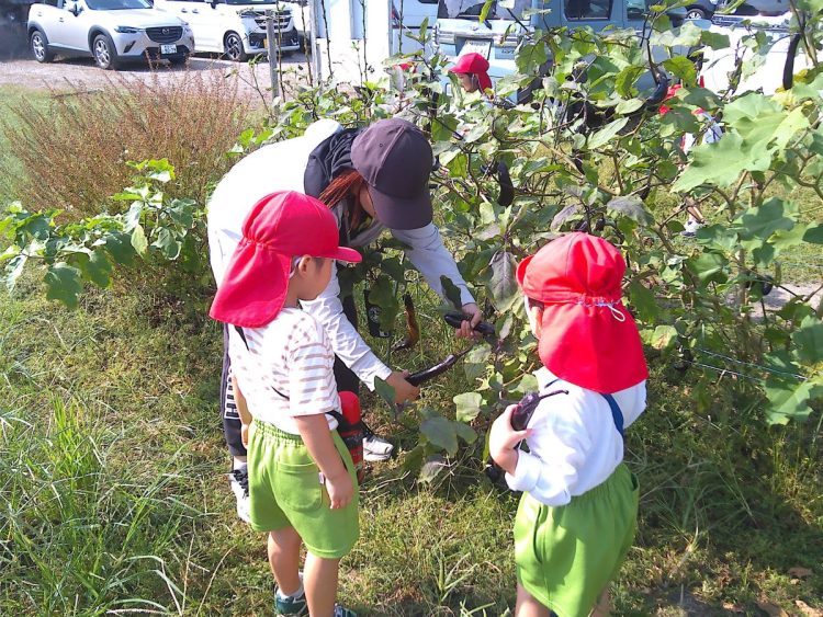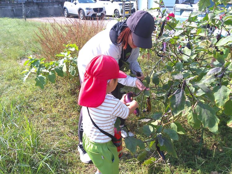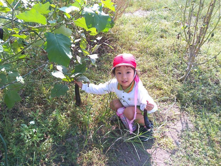 先日、つき組のみなさんが「ナスやピーマンの収穫」を行いました。さすがに気温が低くなってきているせいか、実はそこまで大きくなっていませんでした。もうそろそろ収穫も終わりそうです。それでもこの夏から秋にかけてたくさんの実をつけてくれました。子どもたちも収穫の喜びを感じていたようです。