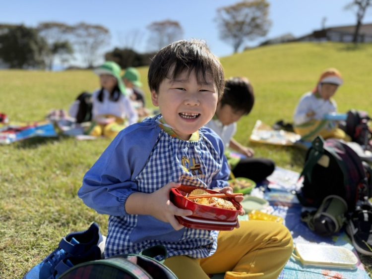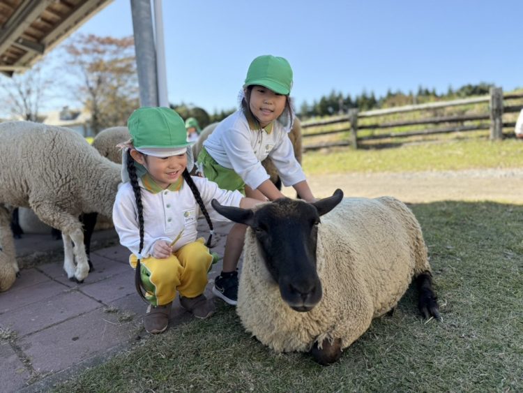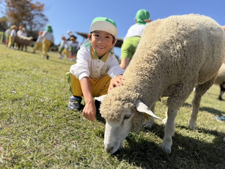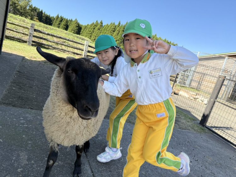 今日は天気が良く、牧場の広場で目いっぱい遊んだり、羊などの動物と触れ合ったりすることができたようです。お弁当も清々しい空気とともにおいしく食べることができたようです。最初は動物を触るのにビクビクしていたお友達もいたようですが、慣れてきた子はかなり触れ合うことができたそうです。楽しい1日になりました。