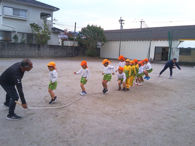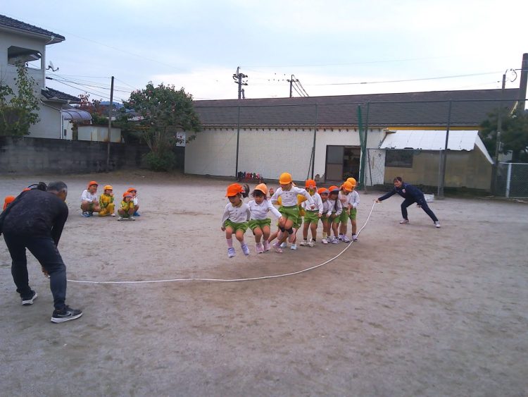 今日の午前中に年長さんが「体育あそび」で縄跳びをしていました。個人跳びのあとに大縄跳びをしていました。タイミングをはかるのが難しそうでした。こらかもがんばろう!