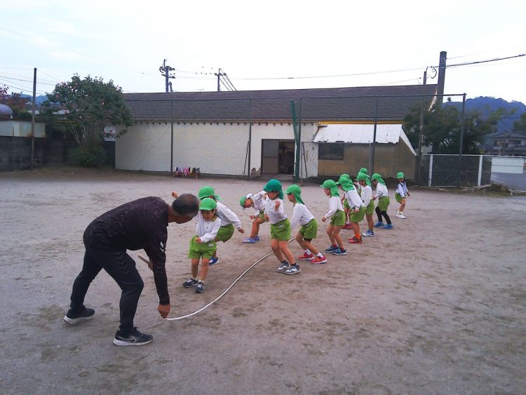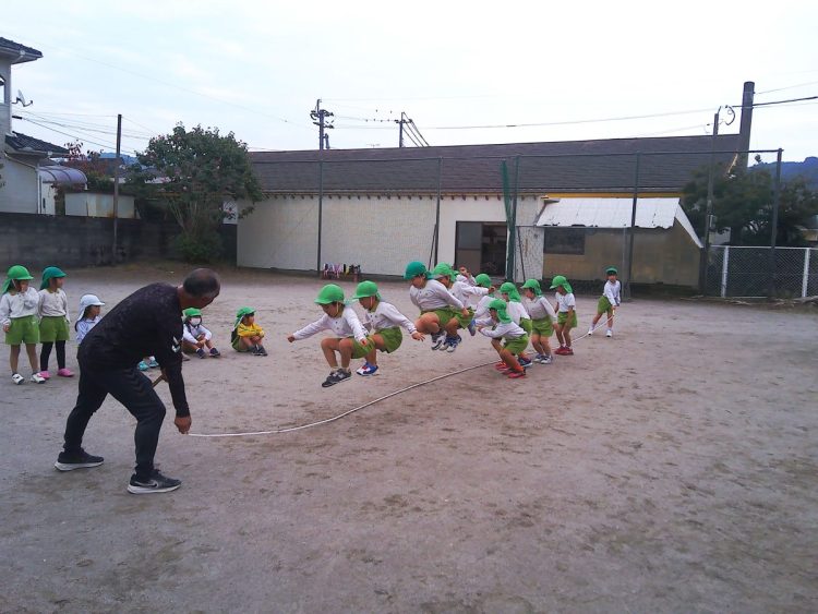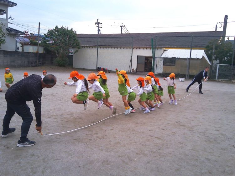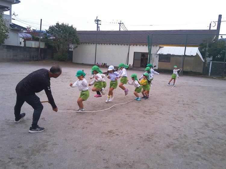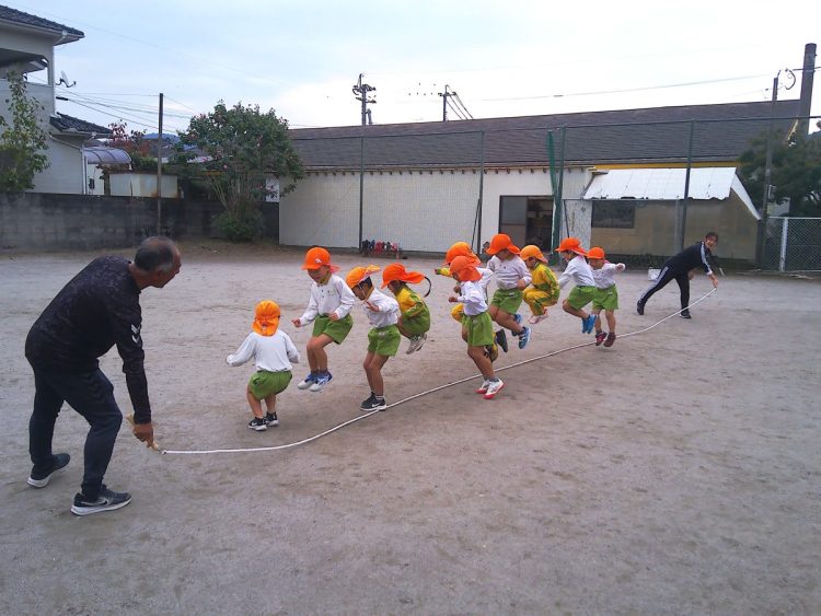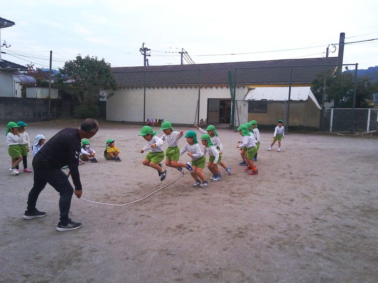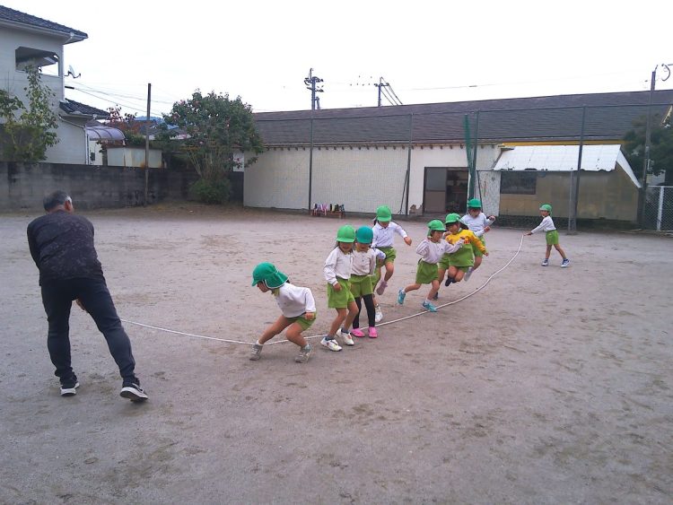 今日の午前中に年長さんが「体育あそび」で縄跳びをしていました。個人跳びのあとに大縄跳びをしていました。タイミングをはかるのが難しそうでした。こらかもがんばろう!