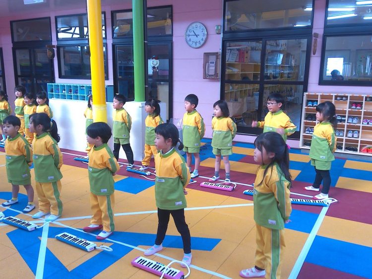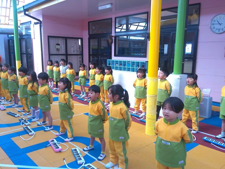年中さんが「フェスティバルの歌の練習」をしていました。衣装を着ていないということでパチリ!ずいぶん声が出てきました。本番が楽しみです。