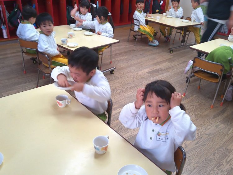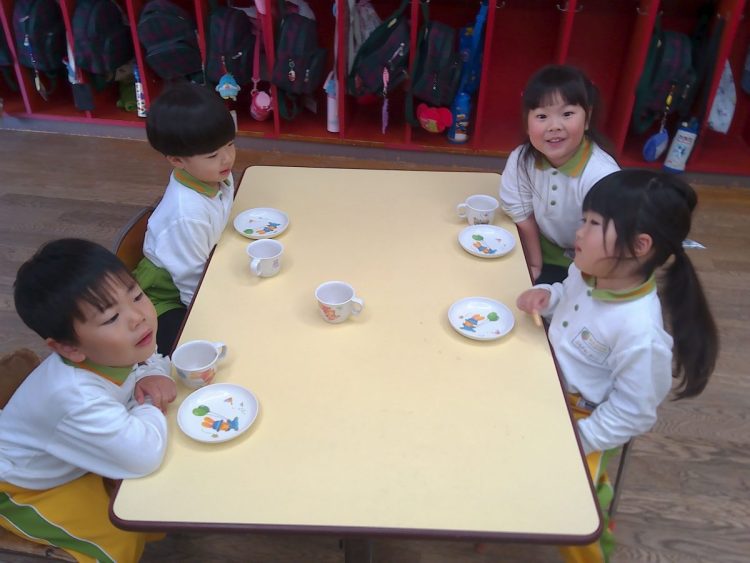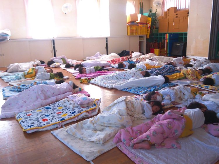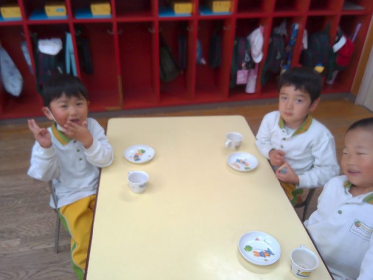 年少さんと年中さんはお昼寝タイム(午睡)ですやすや眠っていました。お昼寝の後はおやつを食べていました。