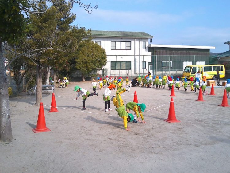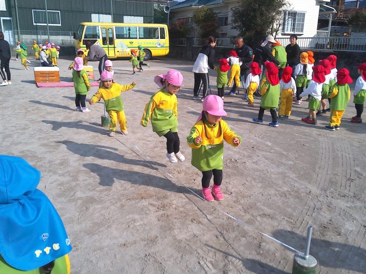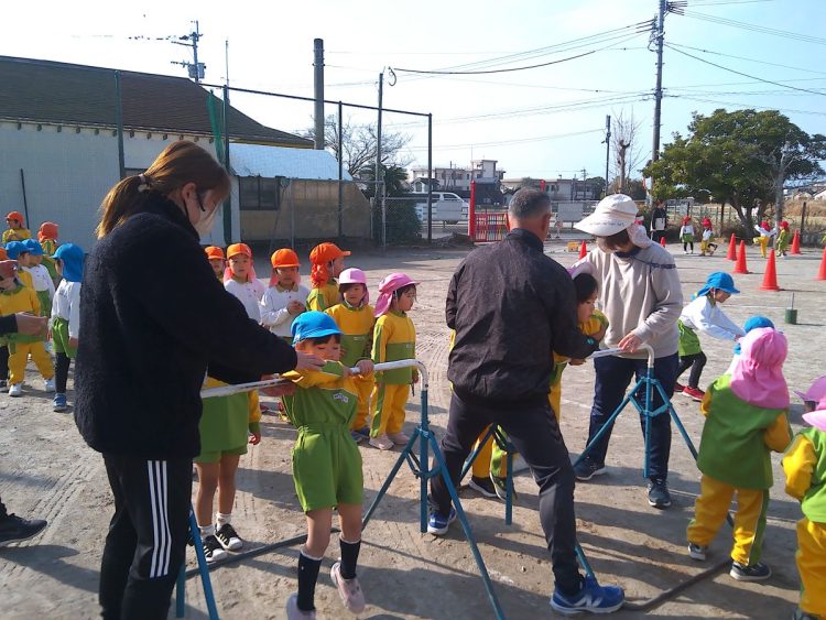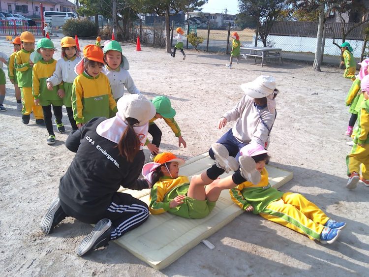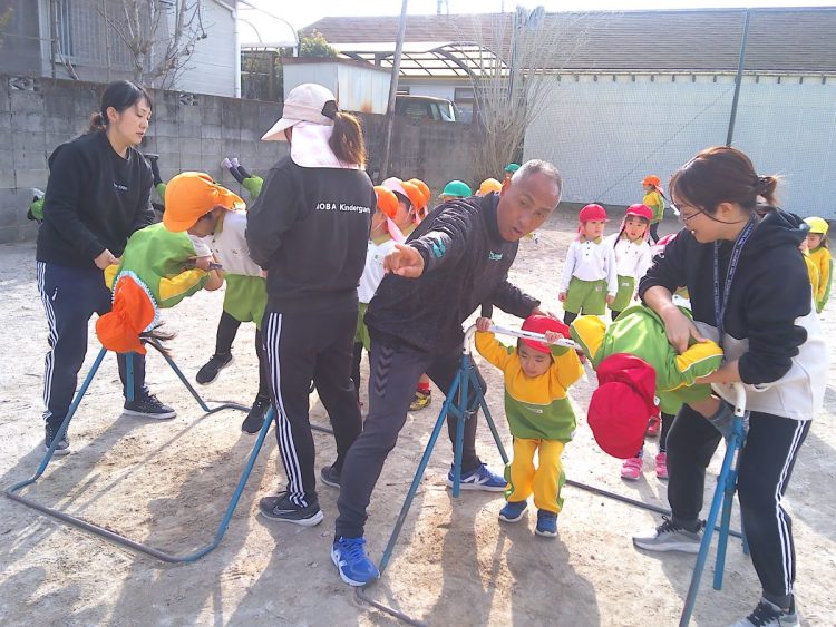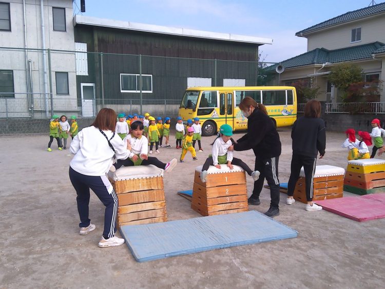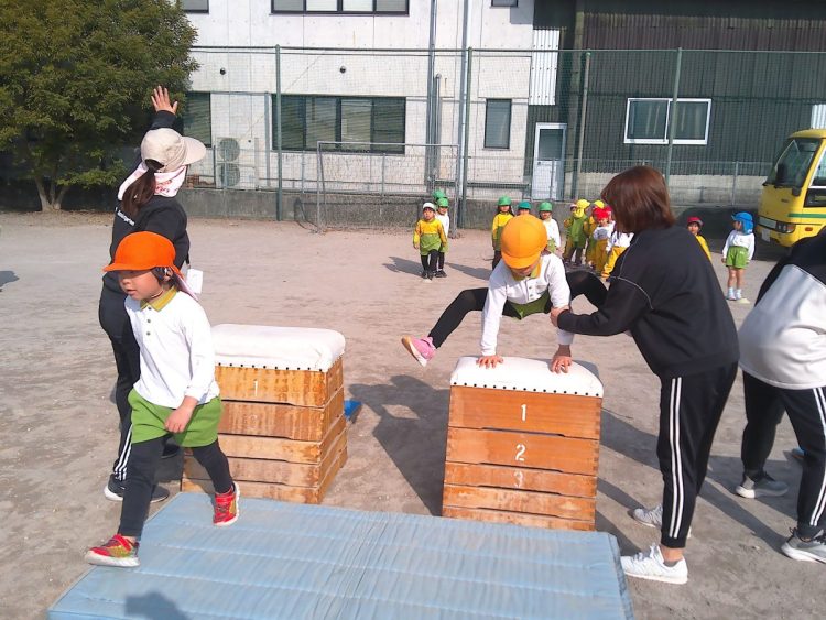 サーキットトレーニング形式で、跳び箱、鉄棒、マット、ゴム跳び、ボールつき、縄跳び、逆立ちなどを順番にしていきます。久しぶりにしたせいか、うまくできない子もいましたが、楽しそうに活動していました。怖がらずにリズムよくできるようになれるといいですね。