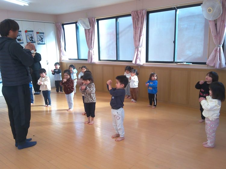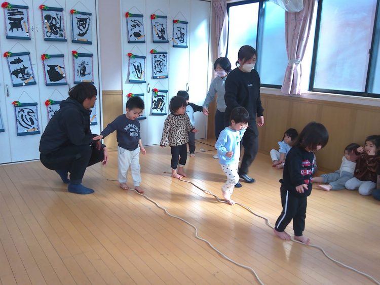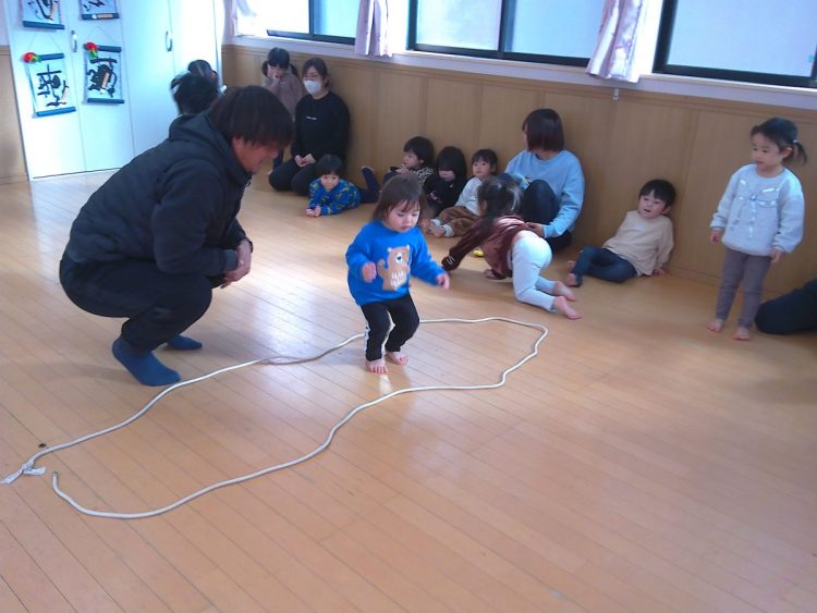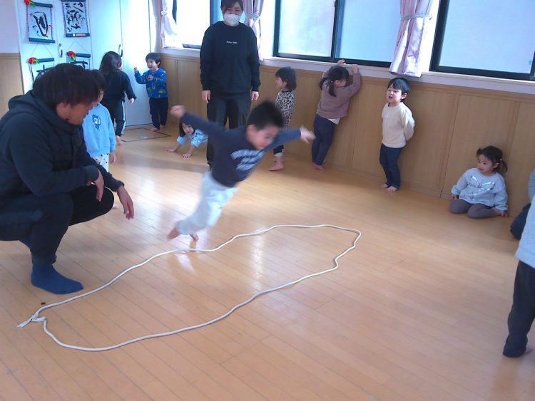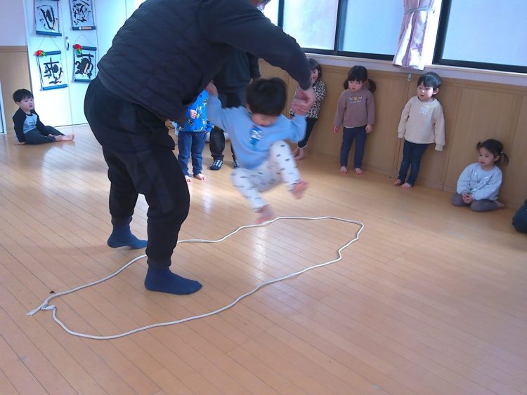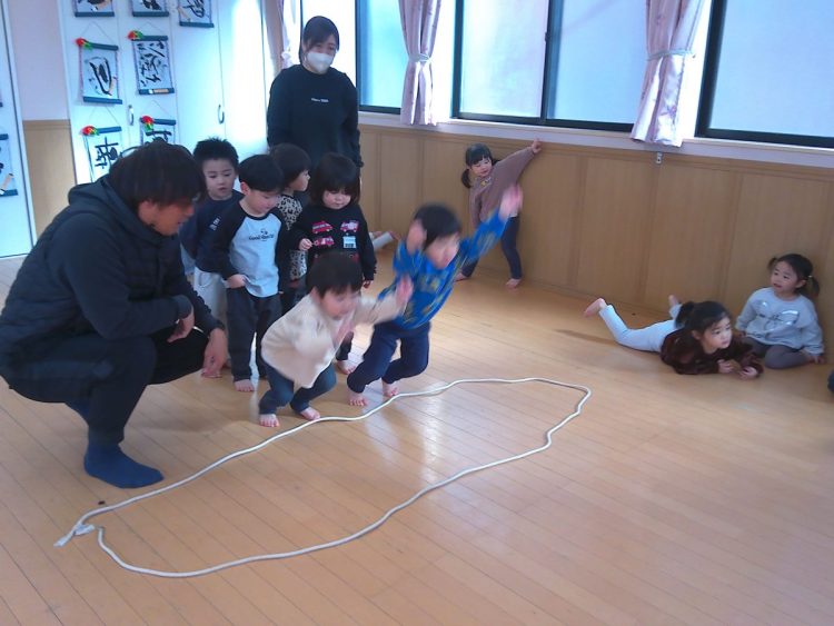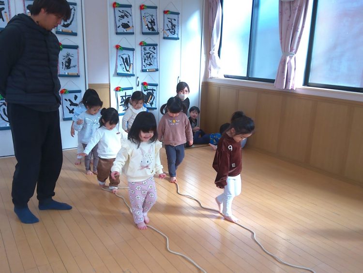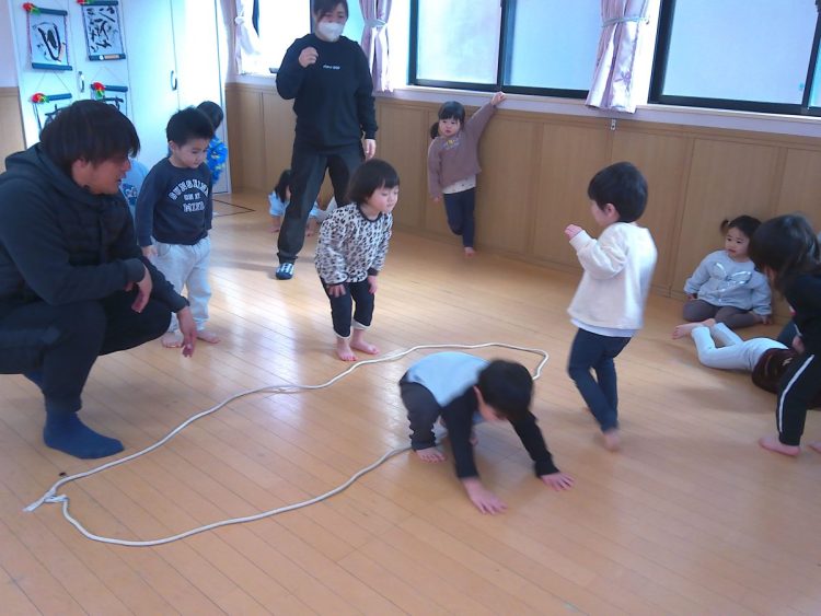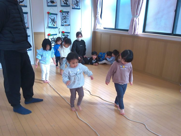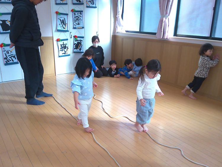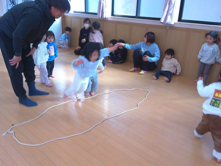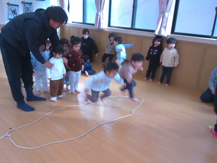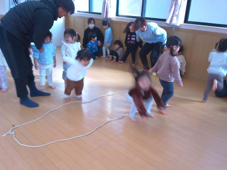 今日の午前中に、うさぎ組さんは「体育あそび」がありました。いつもの太陽スポーツクラブの方から体を動かす遊びを教えてもらいました。今回も長縄を使った運動で、前回の復習と新たな動きに挑戦していました。バランスをとったり、ジャンプしたりと子どもたちは楽しく運動していました。ご指導ありがとうございました。