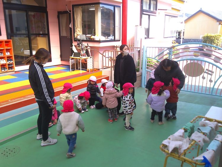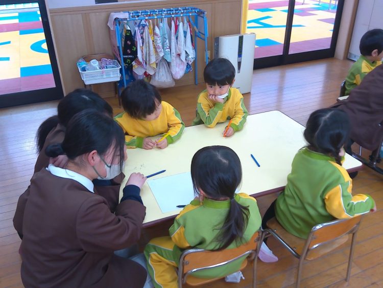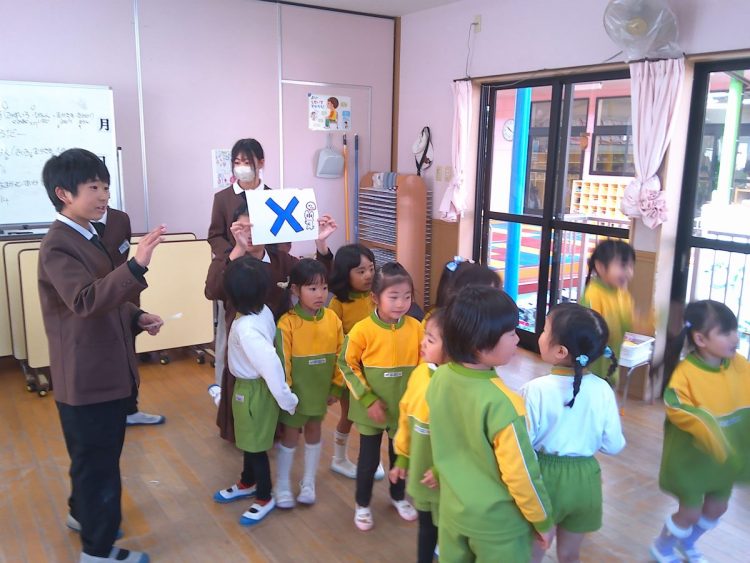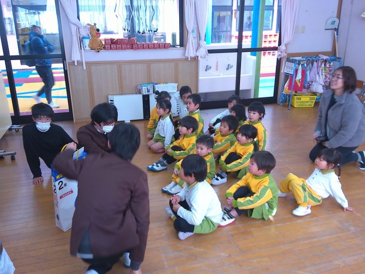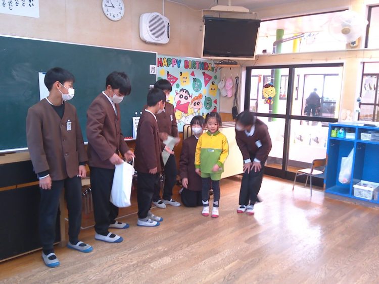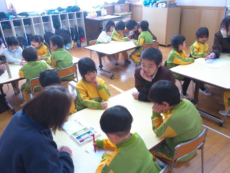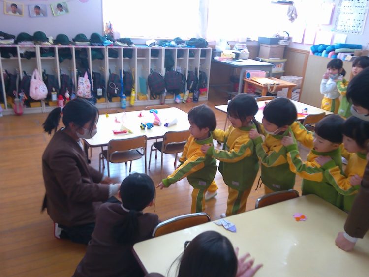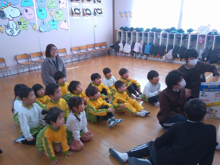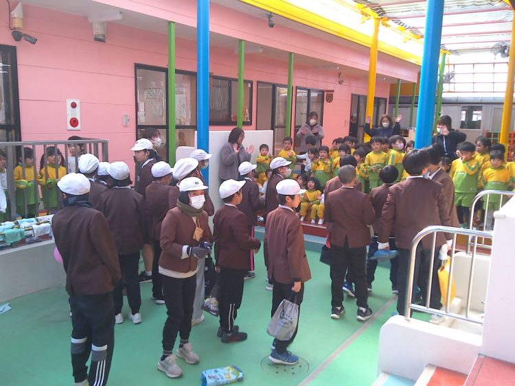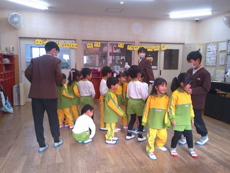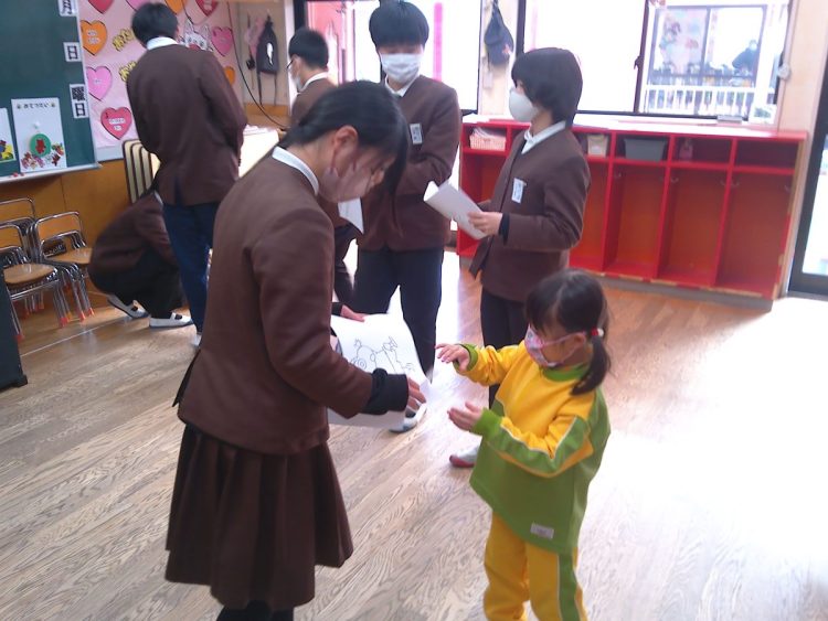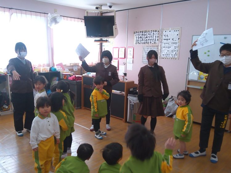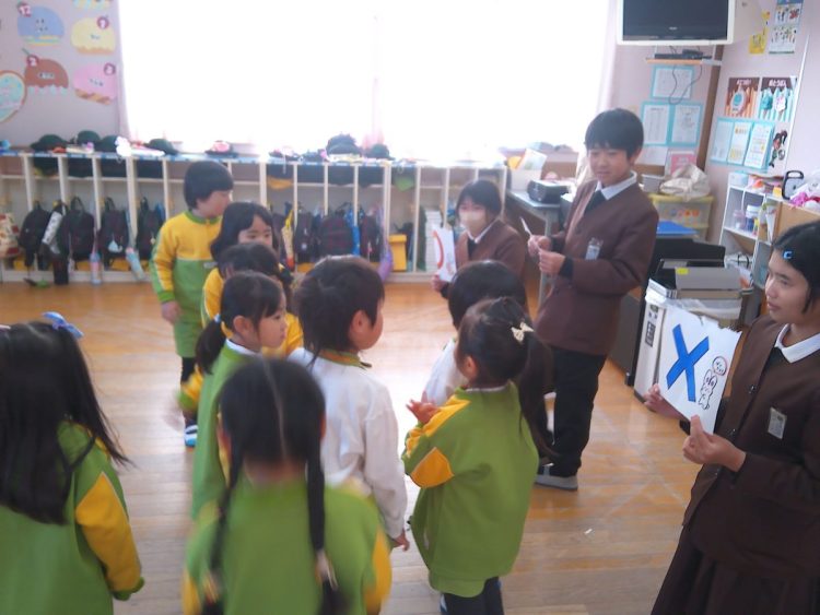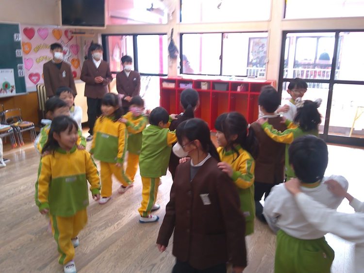 今日の午前中に、青葉小の6年生が以上児園舎にやってきて、園児と交流しました。これは、青葉小の方から「地域とつながる・思い出をつくる・感謝の気持ちを伝える」というねらいのもと、「幼稚園生を楽しませよう」ということで実現したものです。