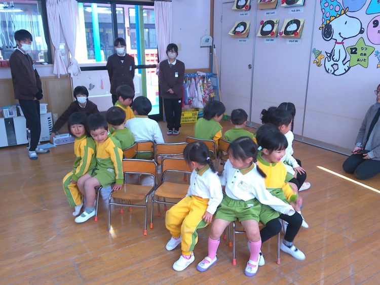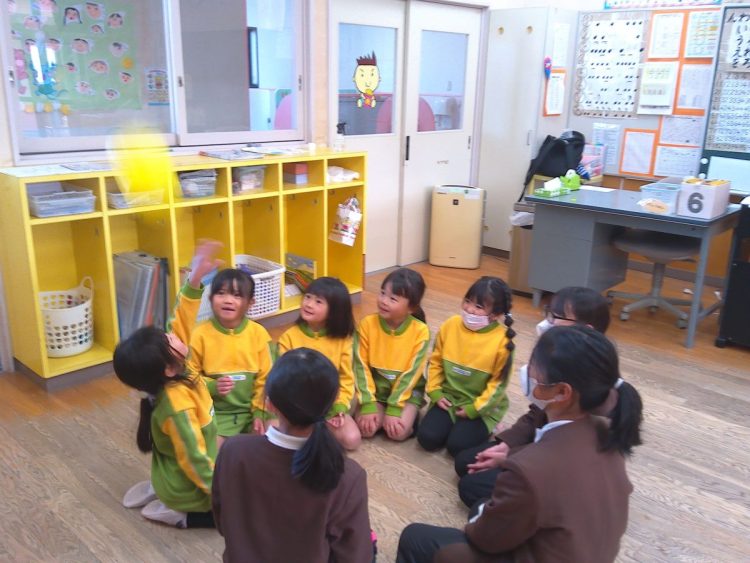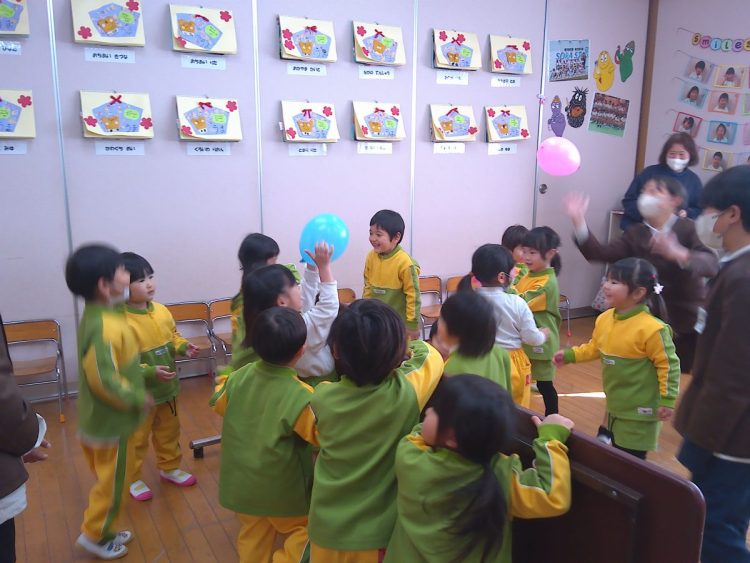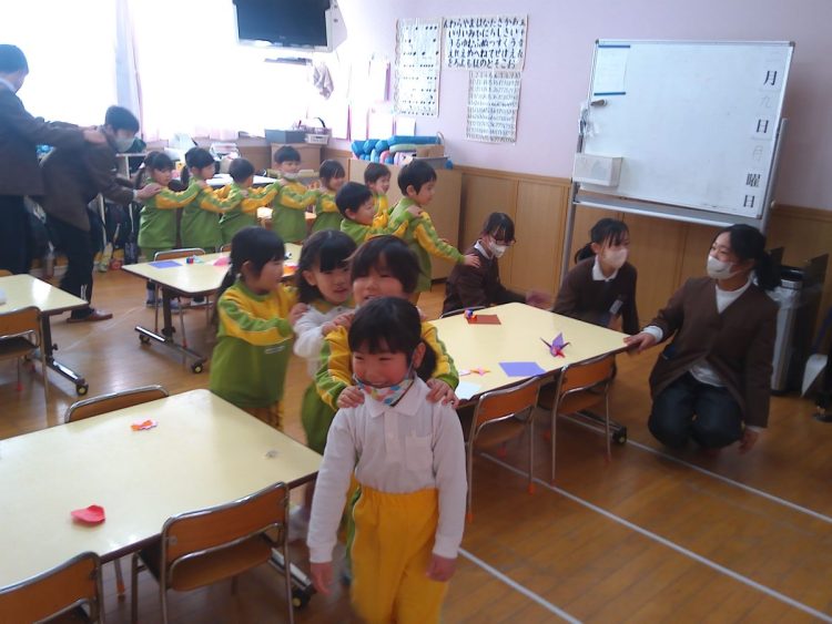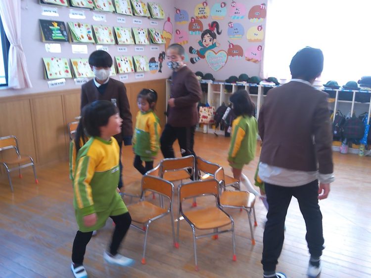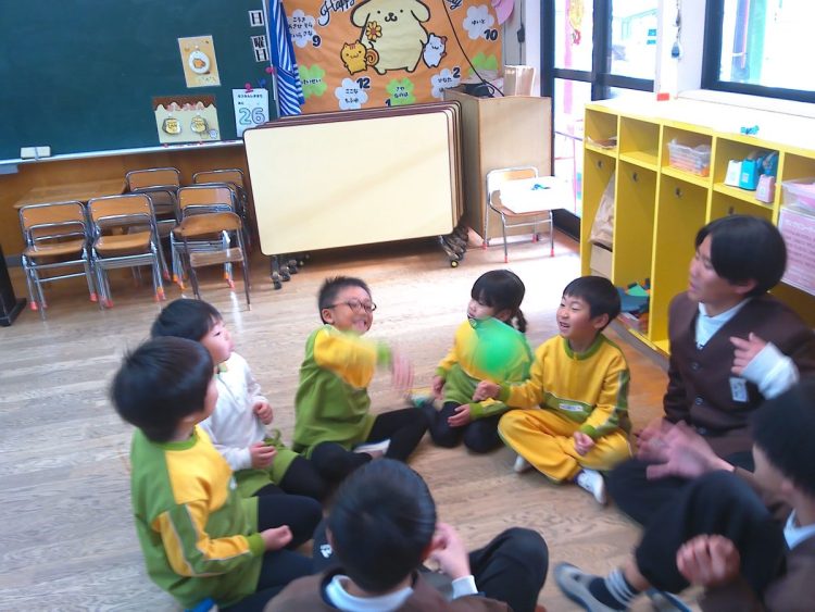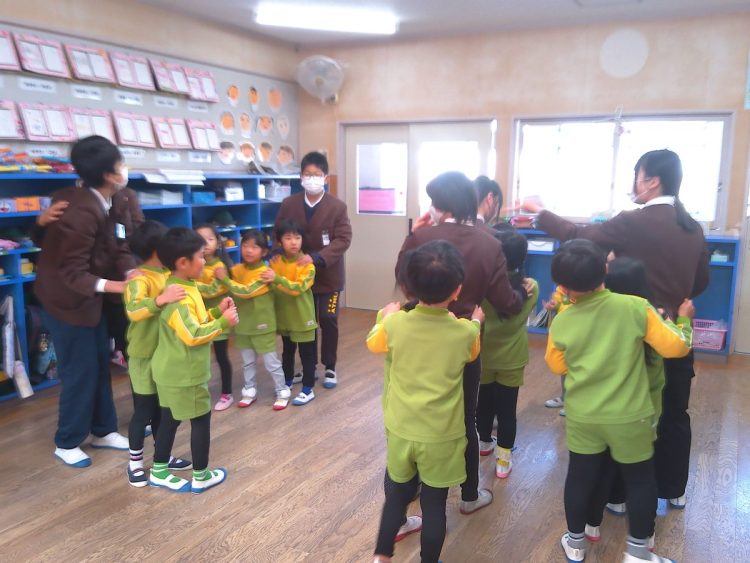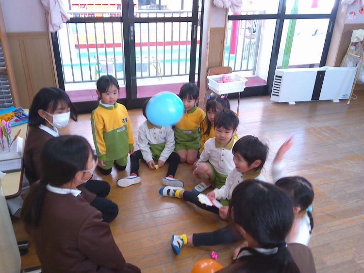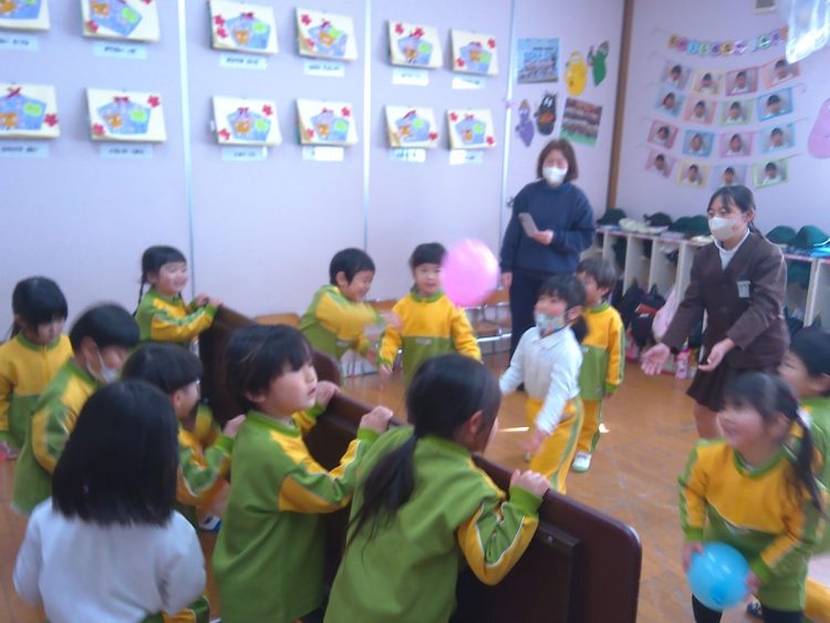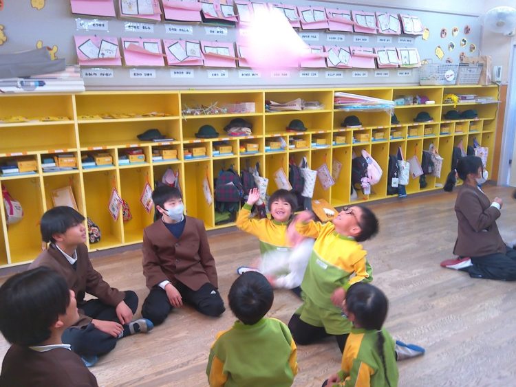 6年生の児童が園児のために、教室内でできるレクリエーションを考えてきて、じゃんけん列車や風船を使ったゲーム、椅子取りゲームなどを子どもの実態に応じたルールで実施していました。最初はお互いに緊張気味でしたが、楽しく活動するうちに声も大きくなり、全員が楽しんでいる姿が見られました。(途中、りす組さんが遊びに来ていました。)