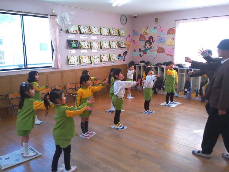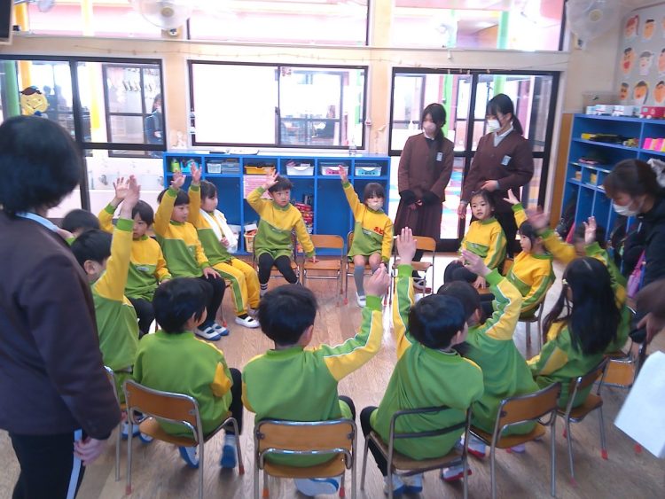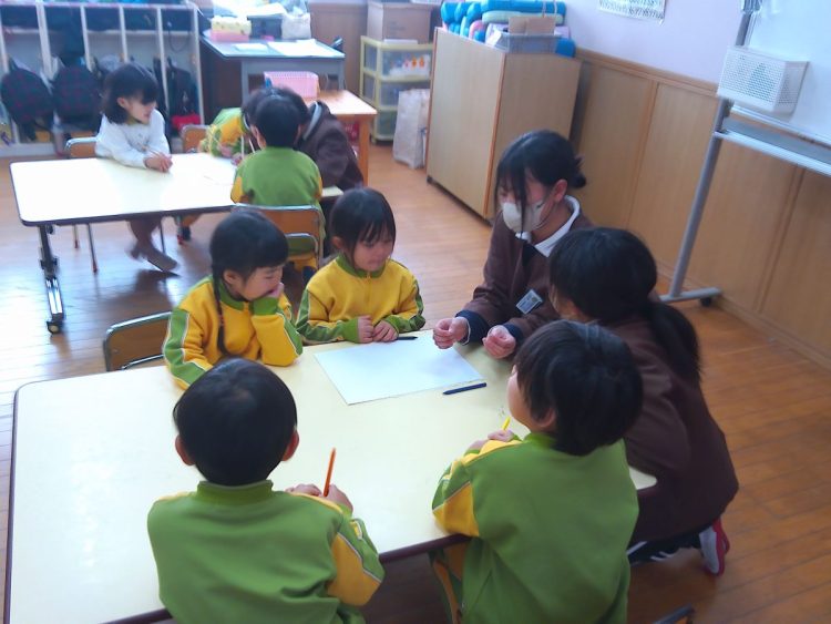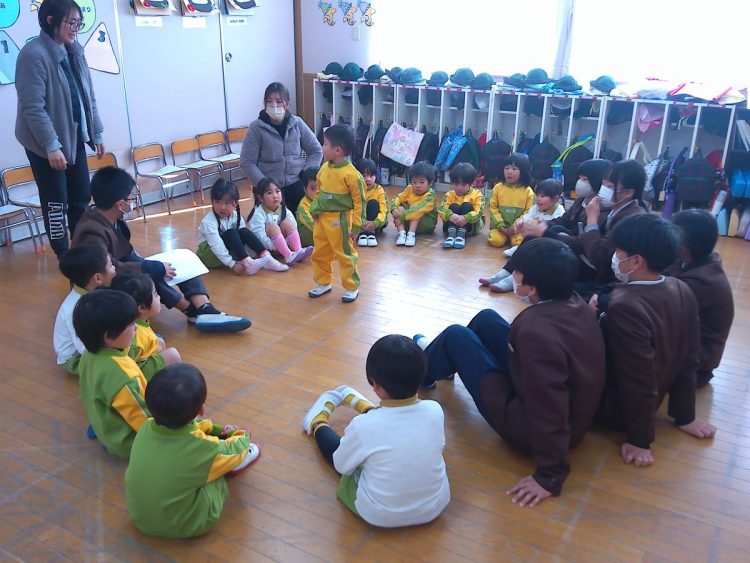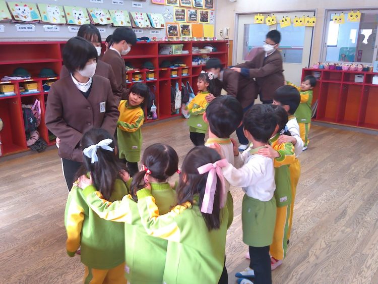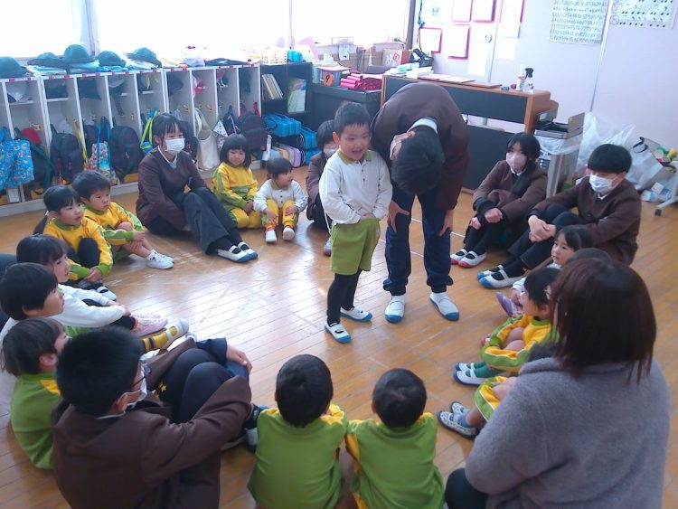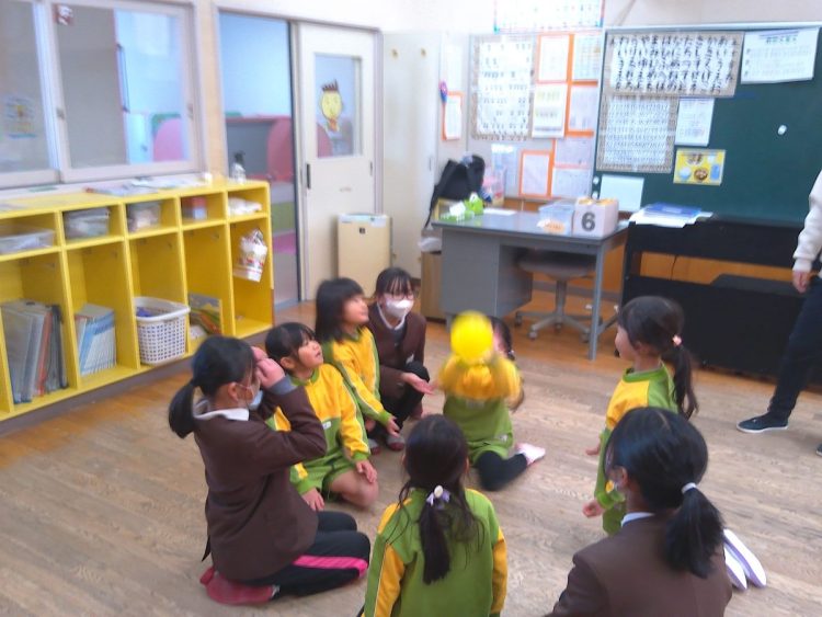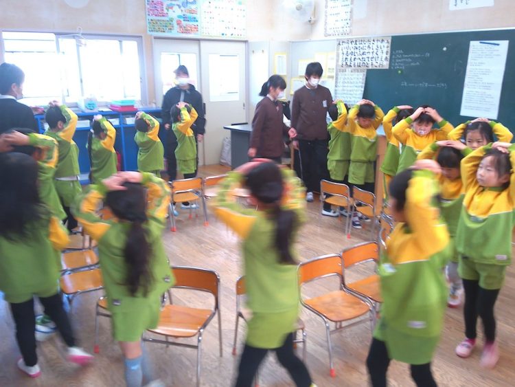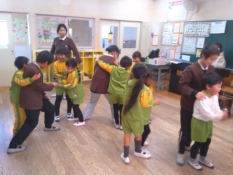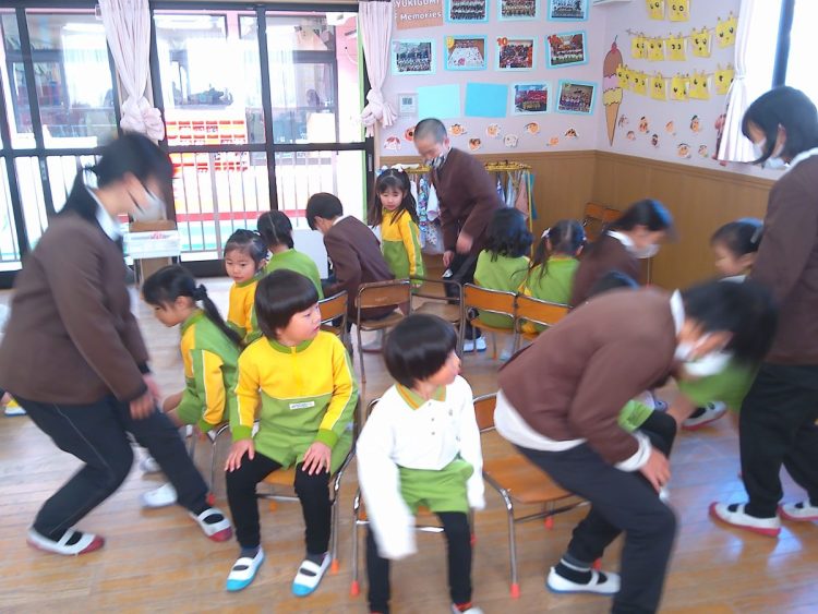 6年生の児童が園児のために、教室内でできるレクリエーションを考えてきて、じゃんけん列車や風船を使ったゲーム、椅子取りゲームなどを子どもの実態に応じたルールで実施していました。最初はお互いに緊張気味でしたが、楽しく活動するうちに声も大きくなり、全員が楽しんでいる姿が見られました。(途中、りす組さんが遊びに来ていました。)