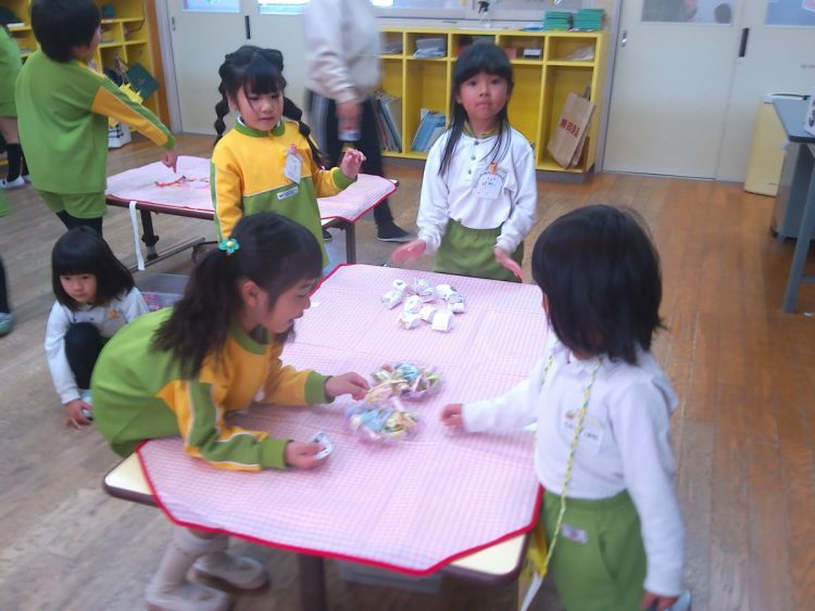 おもちゃ屋、和菓子屋、パン屋、ファストフード店など、6つのお店がオープンし、未満児のお友達も参加してお店屋さんめぐりをしながら買い物をしていました。最後にポップコーンももらって楽しいひと時を過ごしました。