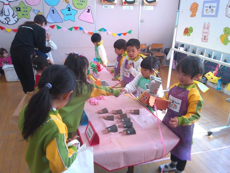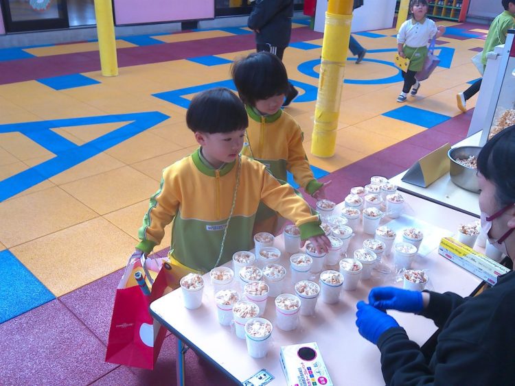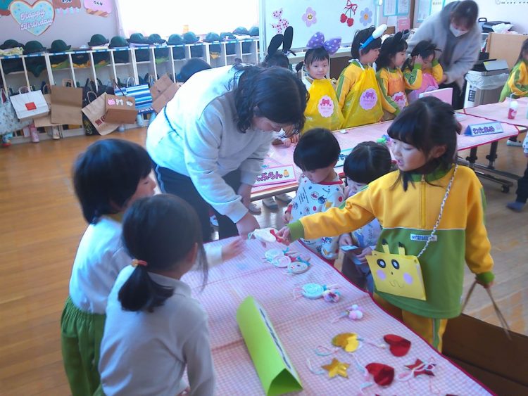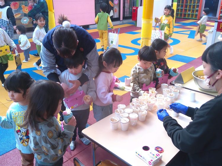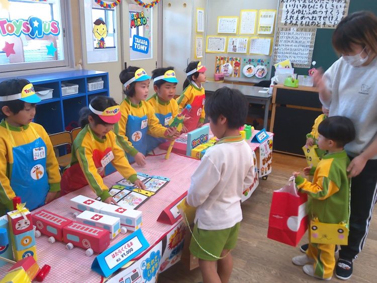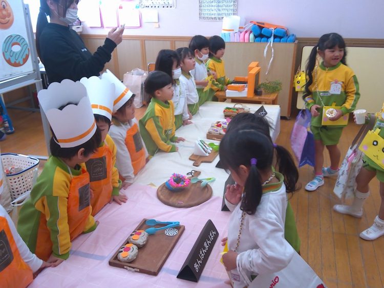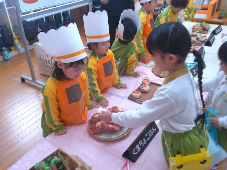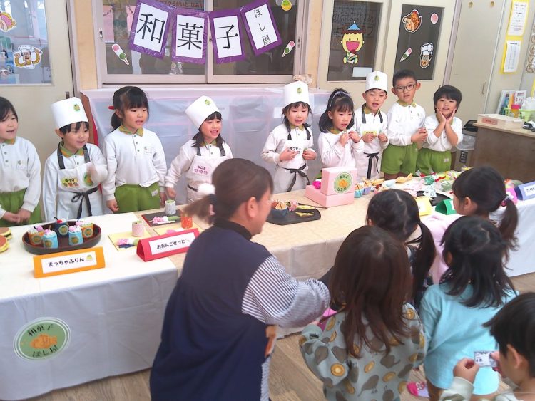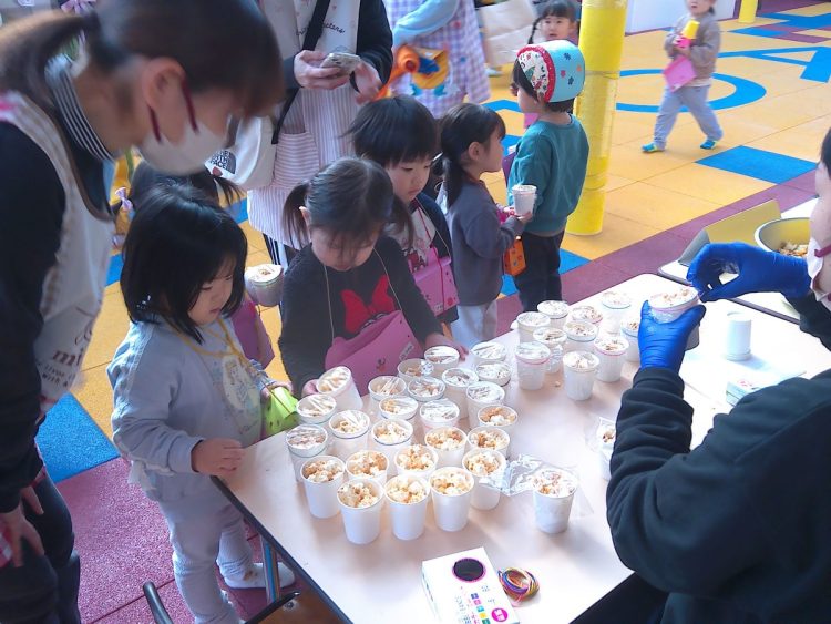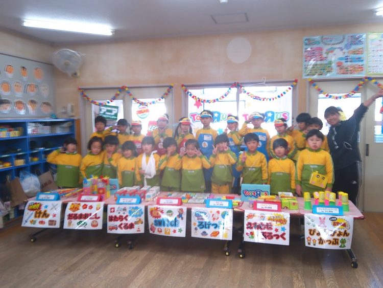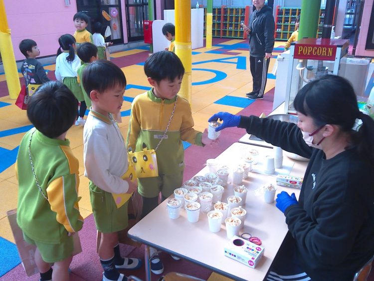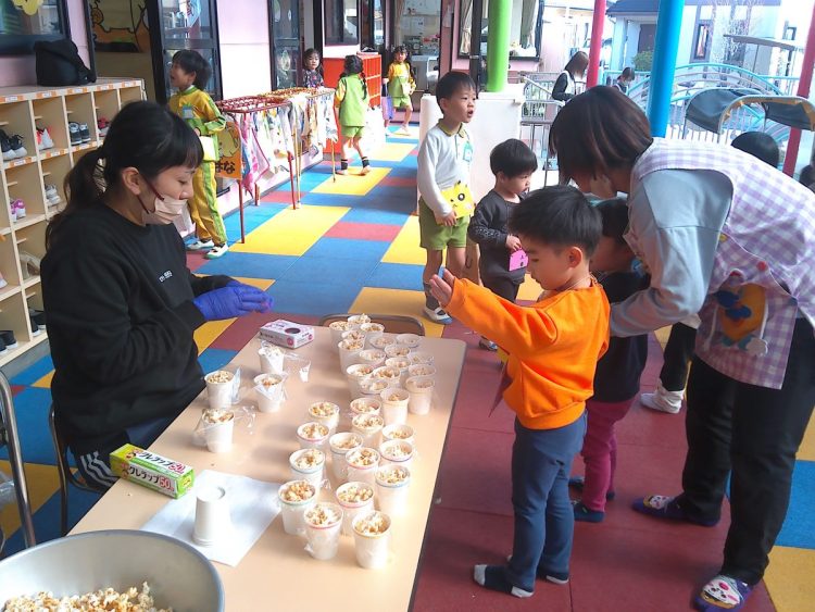 おもちゃ屋、和菓子屋、パン屋、ファストフード店など、6つのお店がオープンし、未満児のお友達も参加してお店屋さんめぐりをしながら買い物をしていました。最後にポップコーンももらって楽しいひと時を過ごしました。