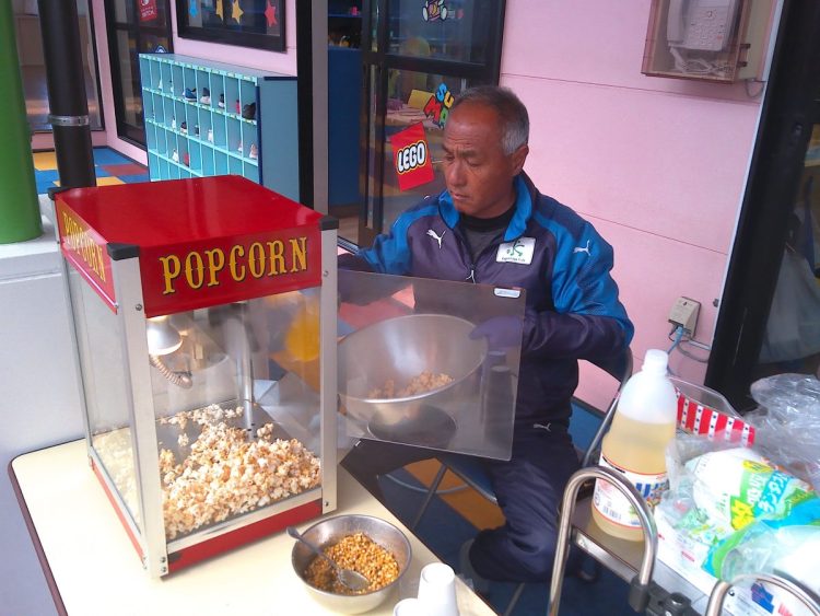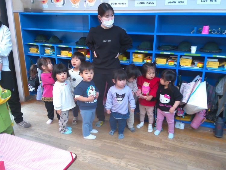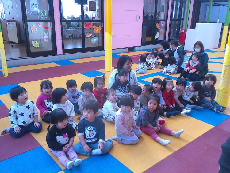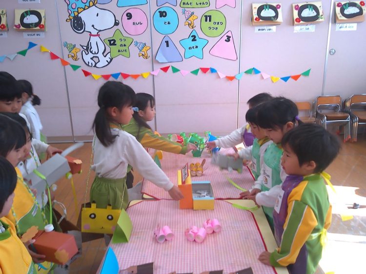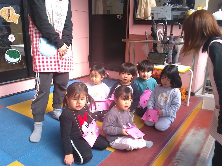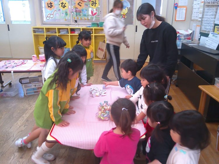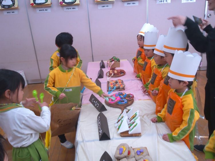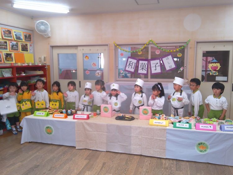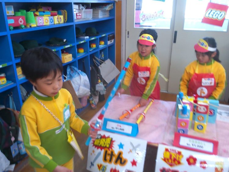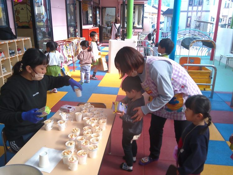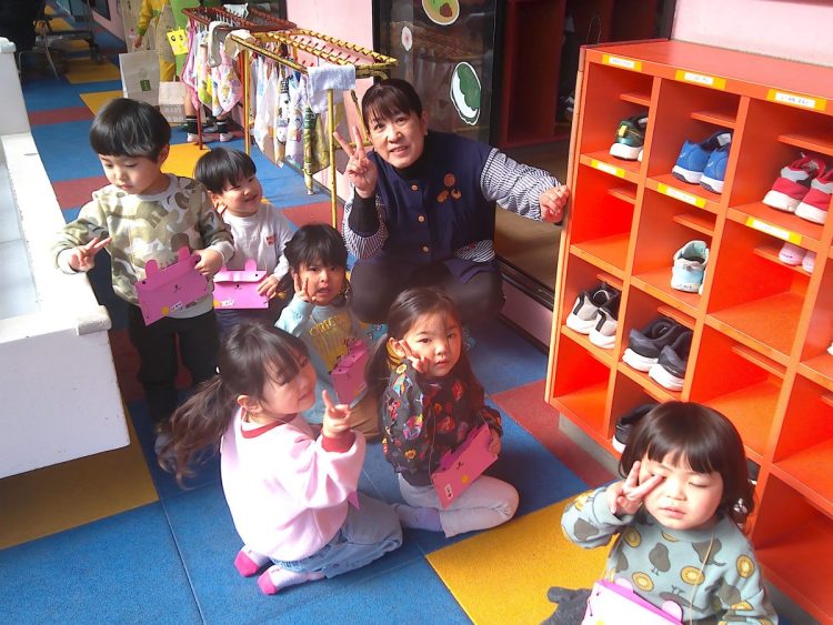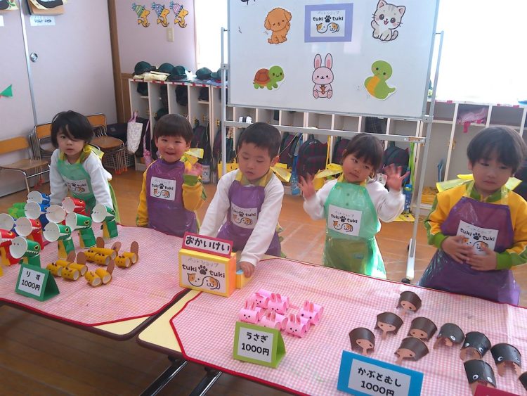おもちゃ屋、和菓子屋、パン屋、ファストフード店など、6つのお店がオープンし、未満児のお友達も参加してお店屋さんめぐりをしながら買い物をしていました。最後にポップコーンももらって楽しいひと時を過ごしました。