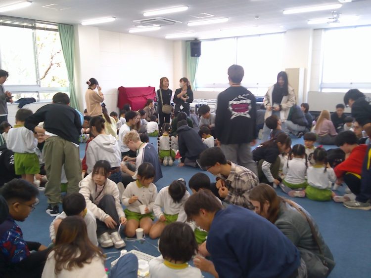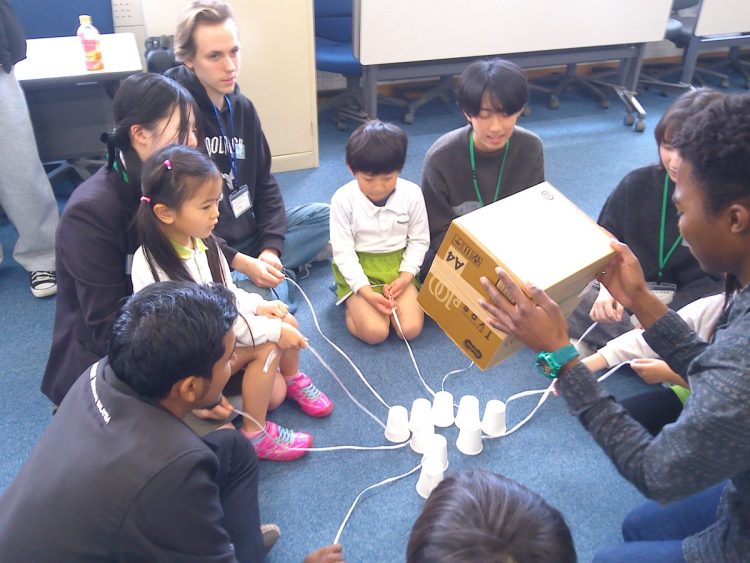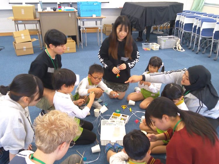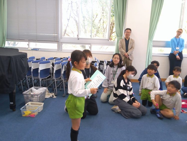 今日、年長さんが、「海外学生と高専生が共同で取り組む国際交流型のワークショップ」に参加しました。これは、未就学児童向けSTEAM(Science, Technology, Engineering, Art, Math)教材・玩具の試作品制作をテーマにした交流会(ワークショップ)で、たまたま本園が運営する児童クラブにバイトできている高専生とのつながりから実現したものでした。