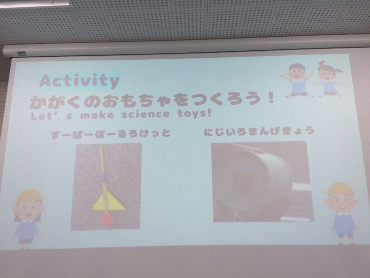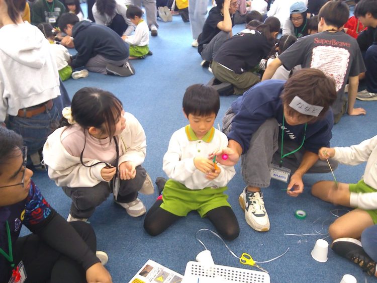 ワークショップではグループごとに自己紹介やレクリエーションを行ってから、本題の①スパーボールロケット作り、②万華鏡作りに取り組みました。学生さんたちに教えてもらいながら楽しく玩具を作って遊びました。