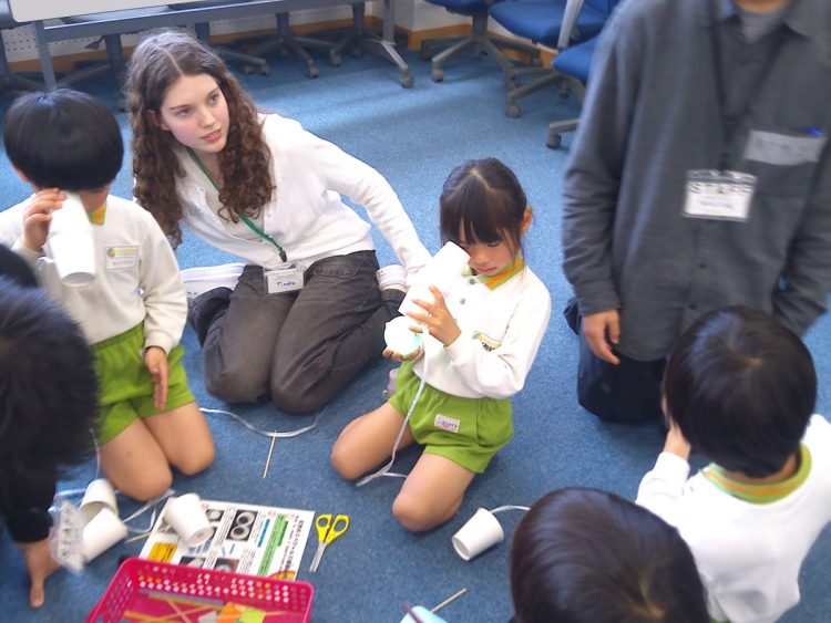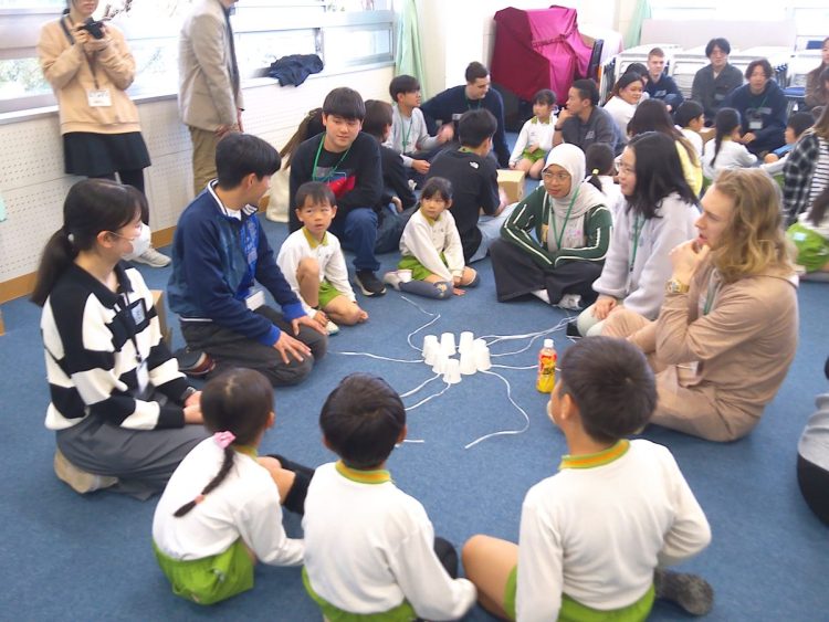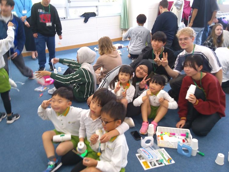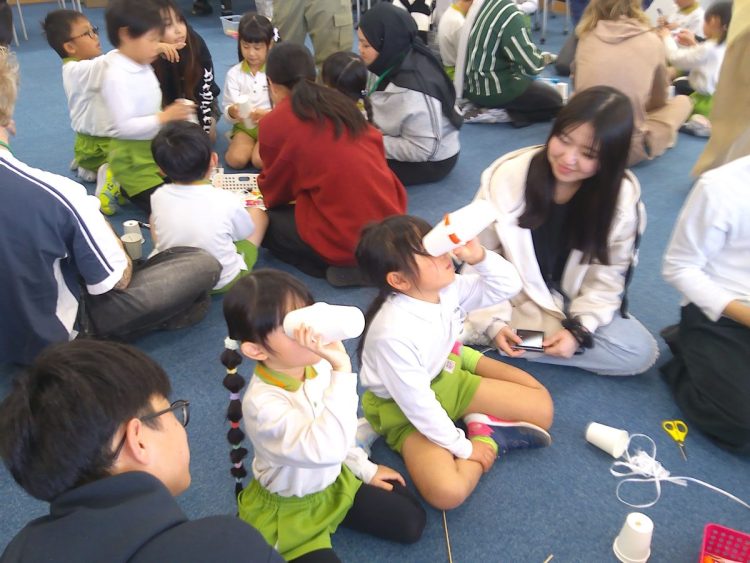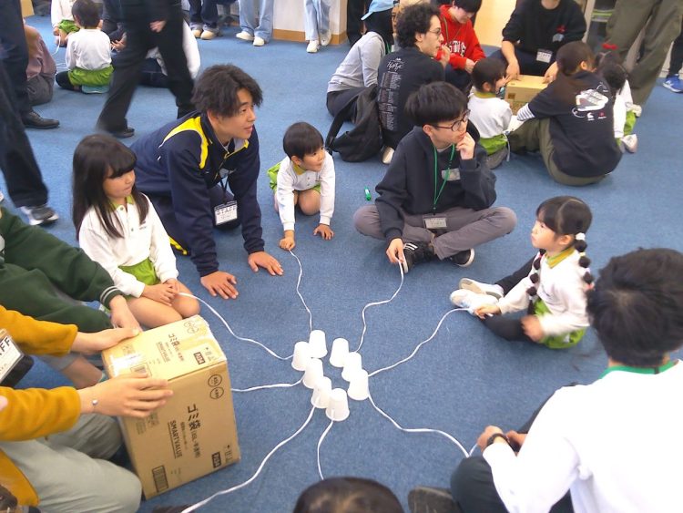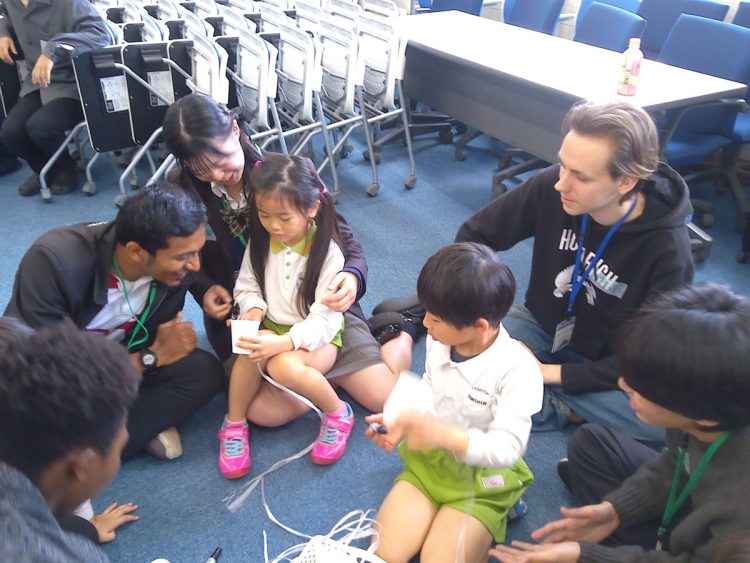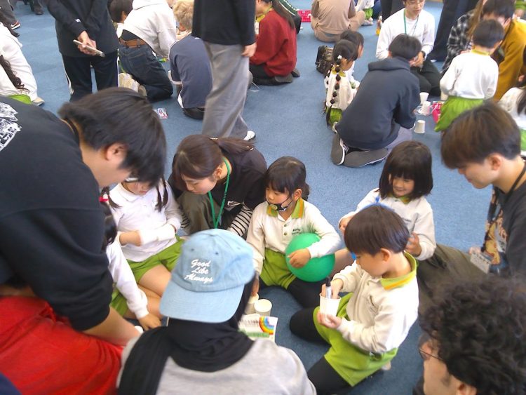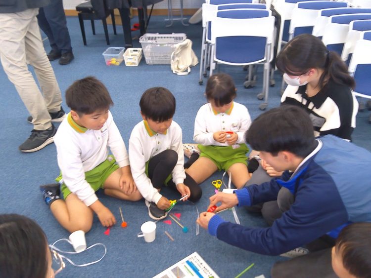 今日、年長さんが、「海外学生と高専生が共同で取り組む国際交流型のワークショップ」に参加しました。これは、未就学児童向けSTEAM(Science, Technology, Engineering, Art, Math)教材・玩具の試作品制作をテーマにした交流会(ワークショップ)で、たまたま本園が運営する児童クラブにバイトできている高専生とのつながりから実現したものでした。