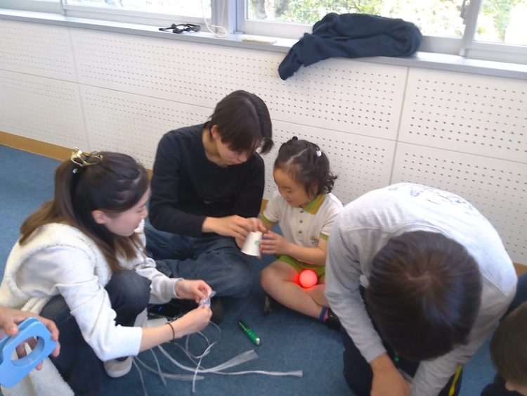ワークショップではグループごとに自己紹介やレクリエーションを行ってから、本題の①スパーボールロケット作り、②万華鏡作りに取り組みました。学生さんたちに教えてもらいながら楽しく玩具を作って遊びました。