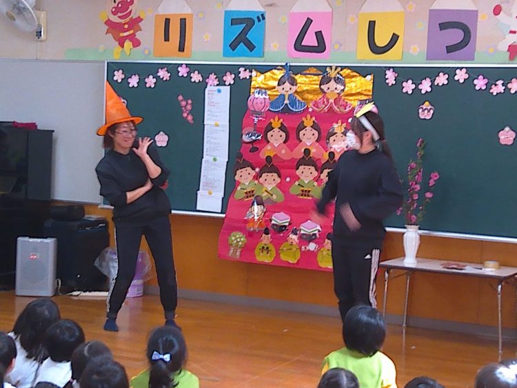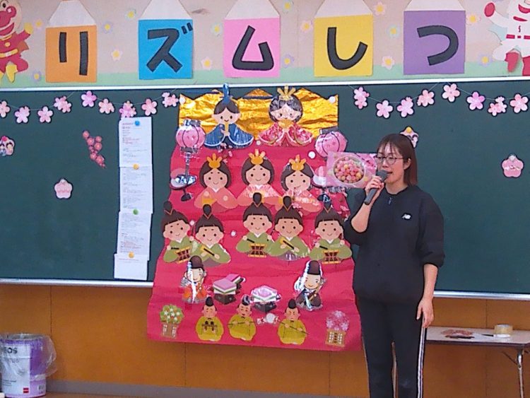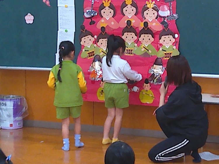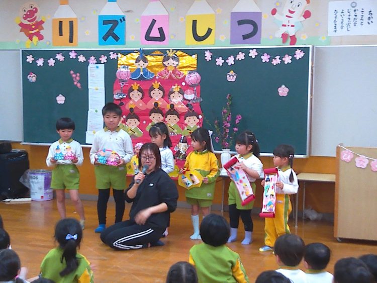 その後、みんなでひな壇(ひな飾り)を作り上げたり、各学級で取り組んだひな祭り制作の発表を行ったり、職員によるひな祭りに関する創作劇の発表があったりと、楽しい時間を過ごすことができました。