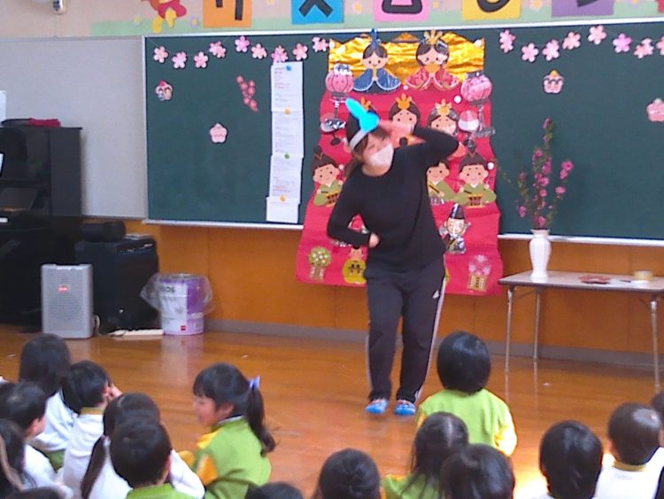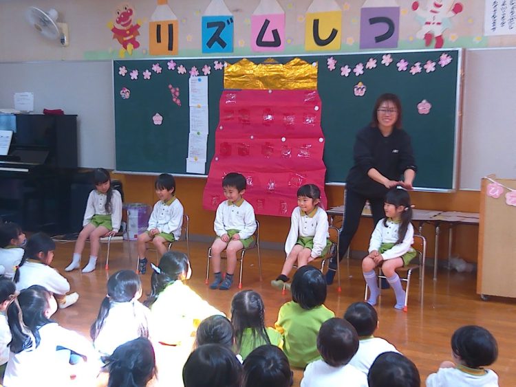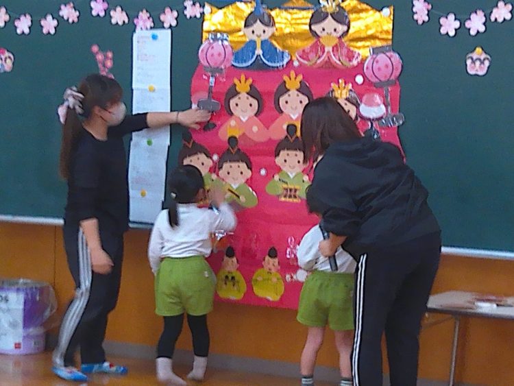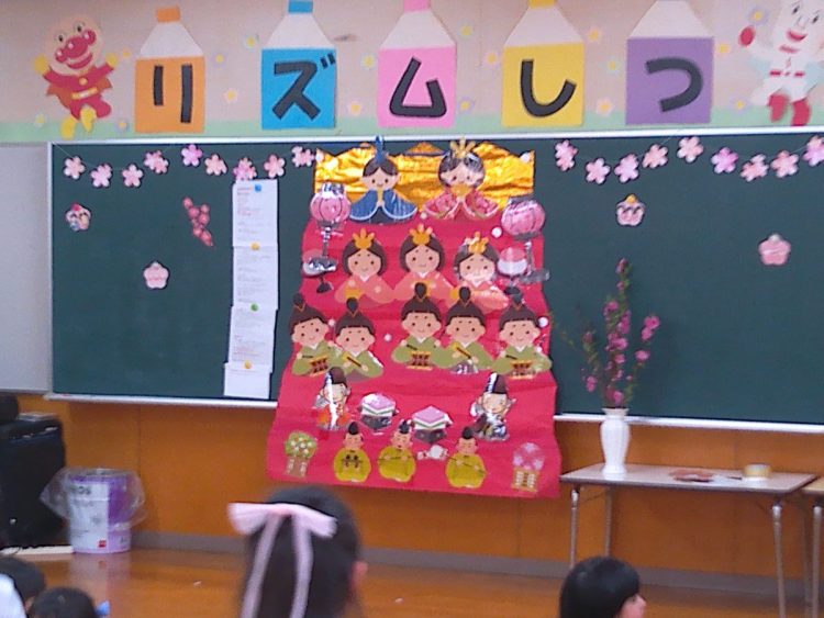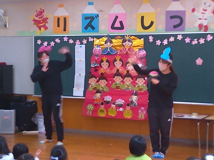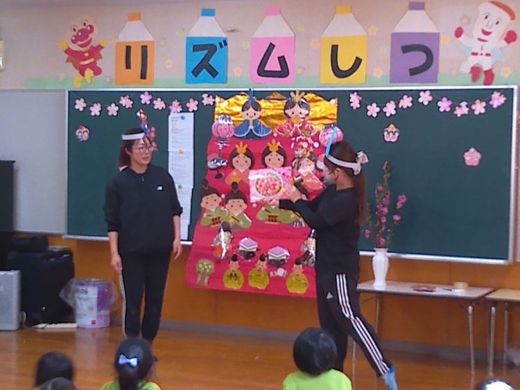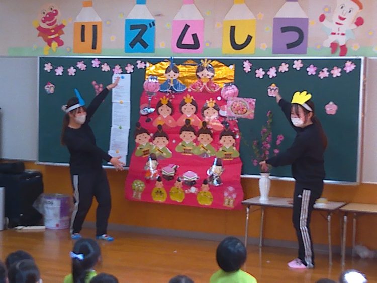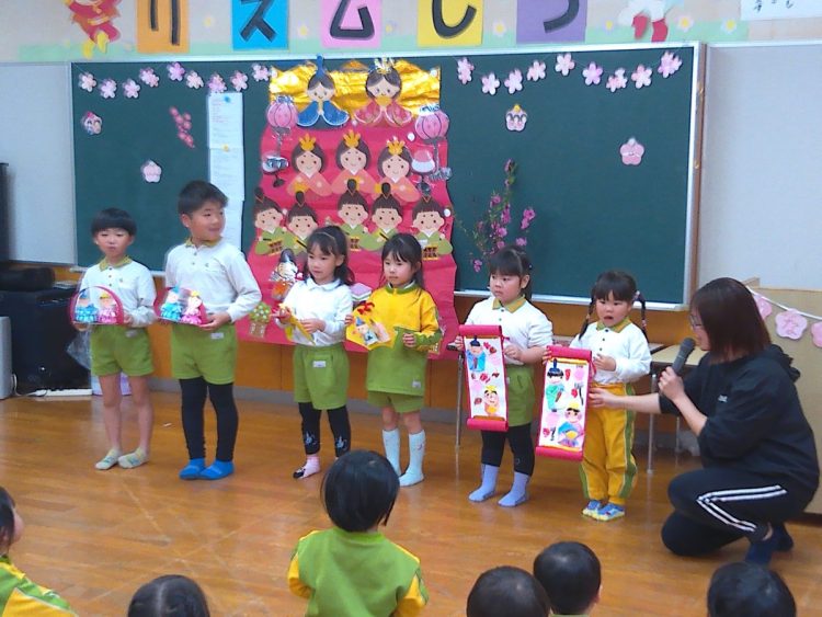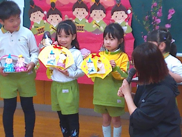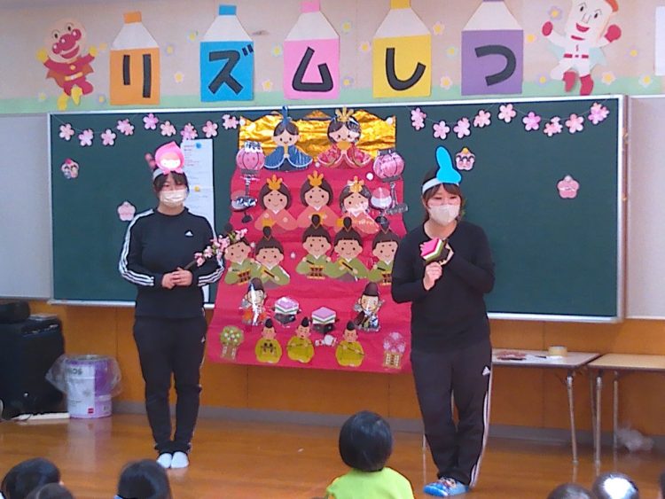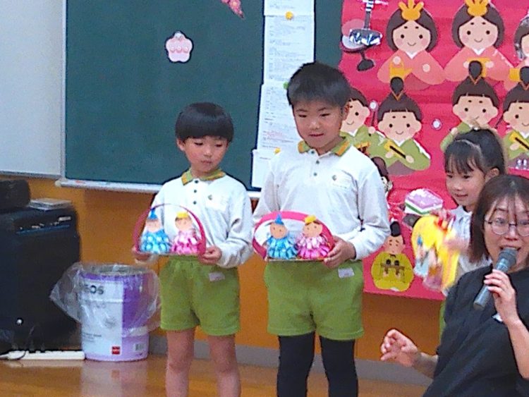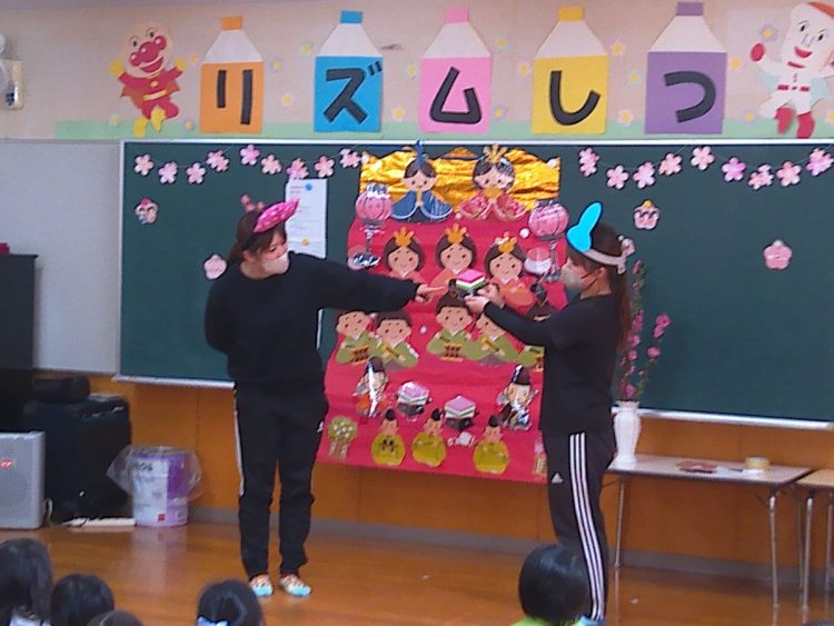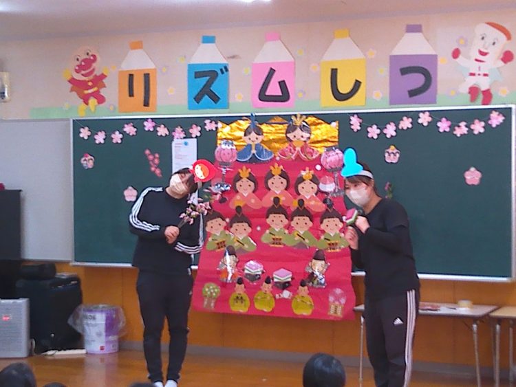 その後、みんなでひな壇(ひな飾り)を作り上げたり、各学級で取り組んだひな祭り制作の発表を行ったり、職員によるひな祭りに関する創作劇の発表があったりと、楽しい時間を過ごすことができました。