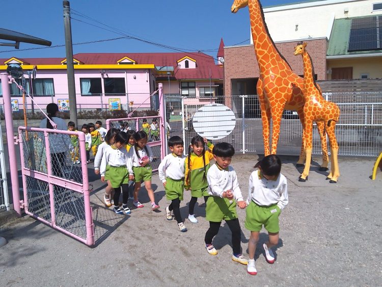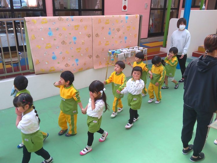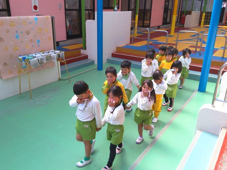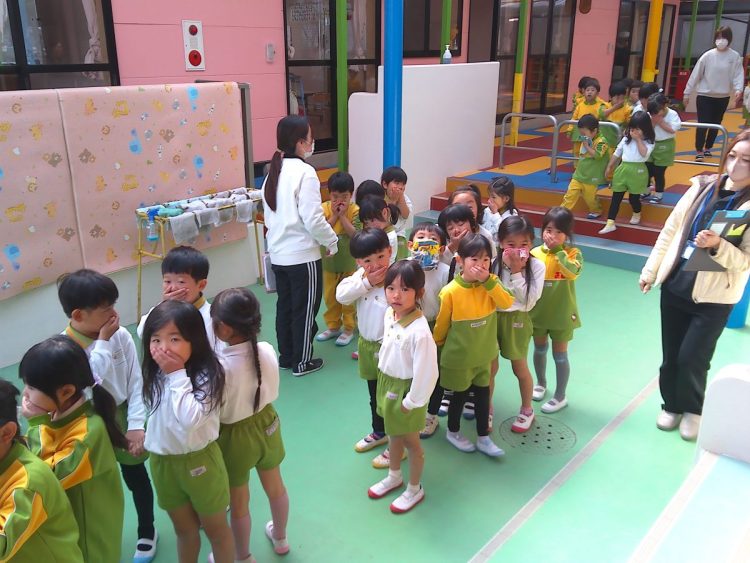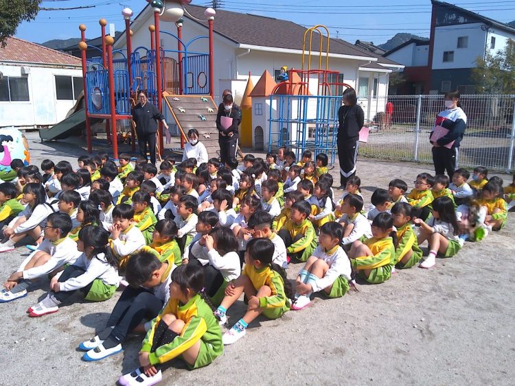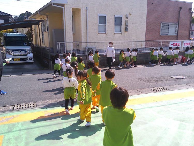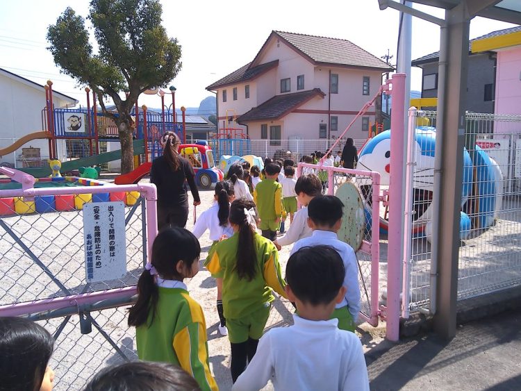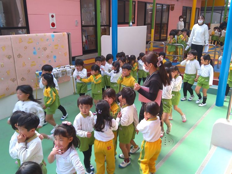 以上児園舎では、地震が起こって火事が発生した想定で遊具場への避難を行いました。