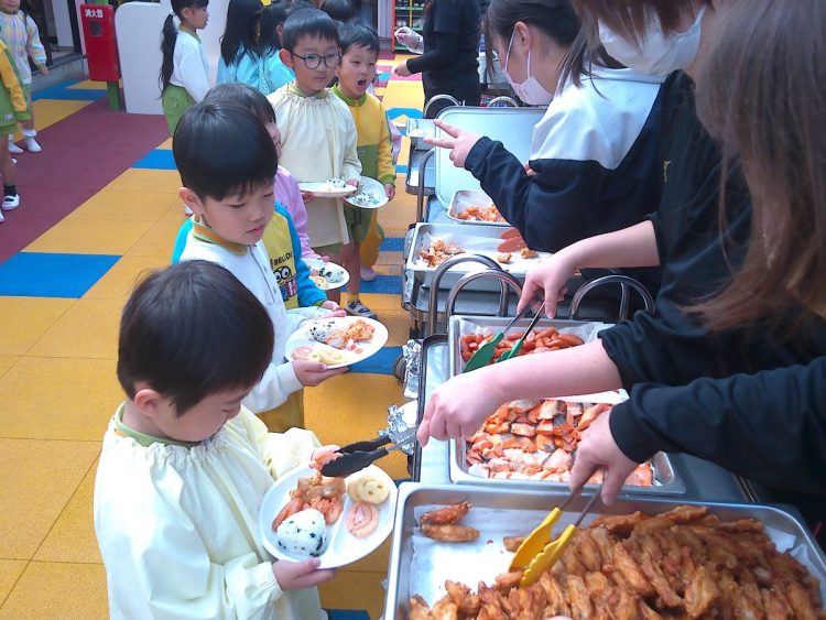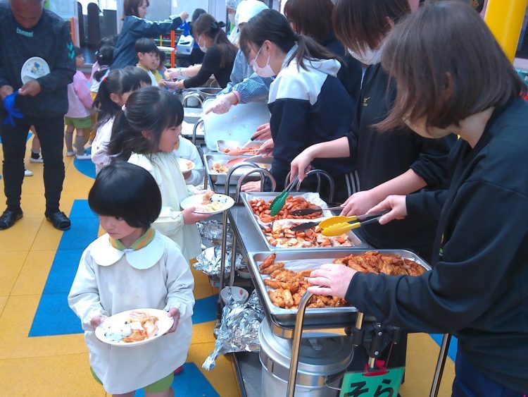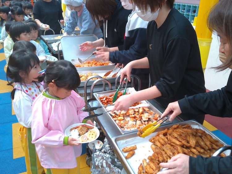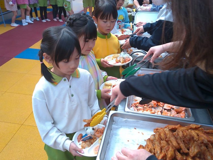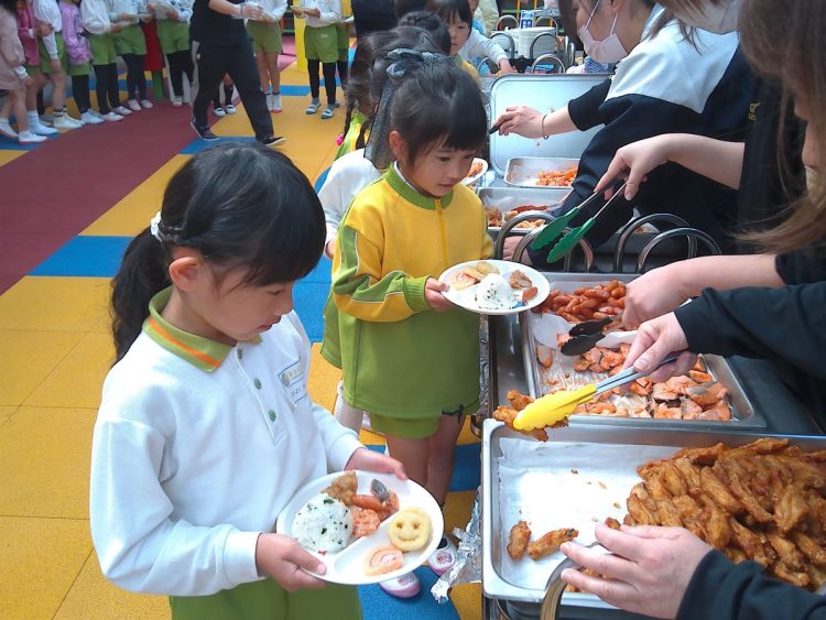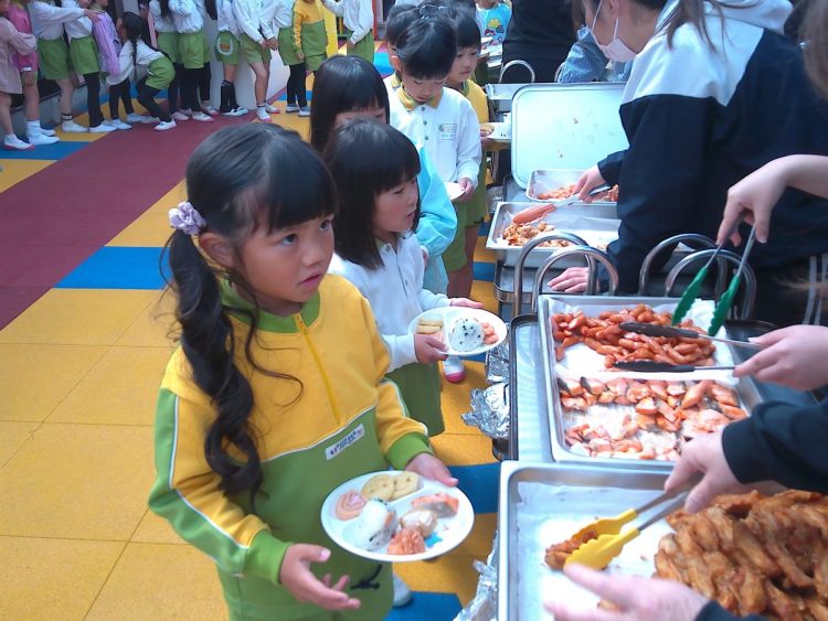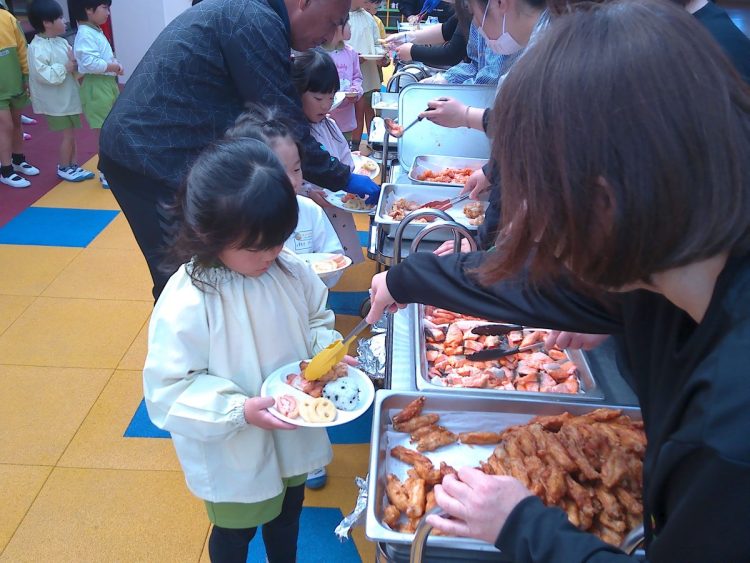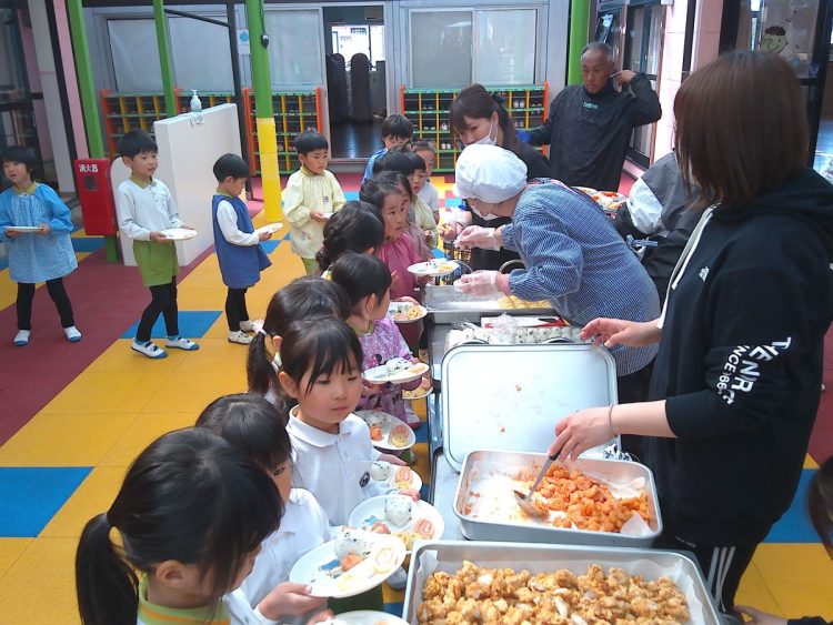 昨日の昼食は、年少~年長が入り混じっての「バイキング給食」でした。好きな具材を好きなだけ盛ってもらい、おかわりも自由でした。子どもたちはいつもと違うお友達や先生と一食に食事をし、楽しい雰囲気の中でおいしく給食をいただくことができました。