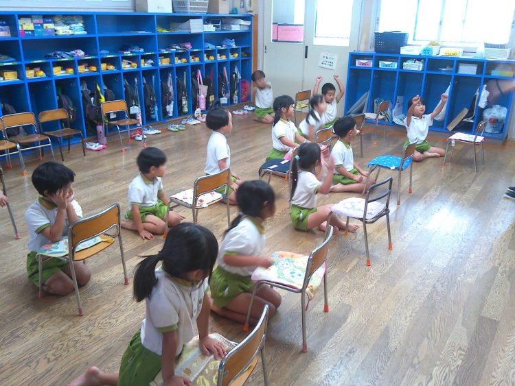 昨日、年長さんが「太鼓(宮太鼓)の練習」をしていました。教室では椅子を太鼓に見立てて練習していました。
