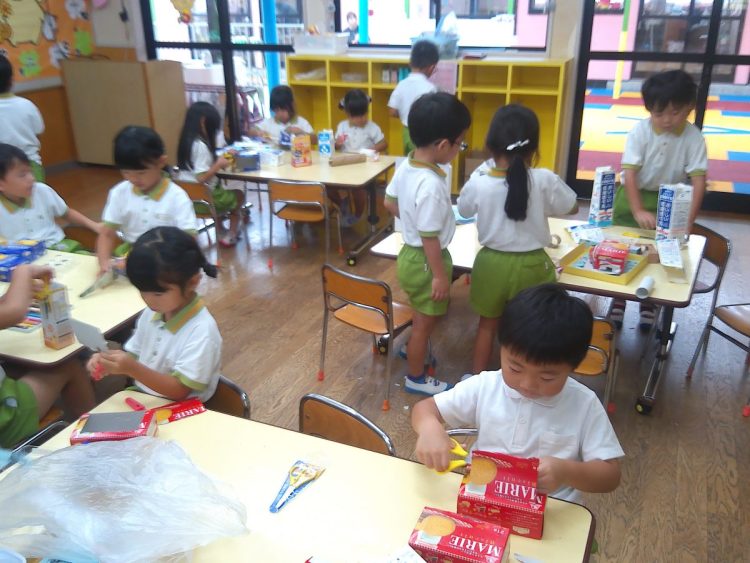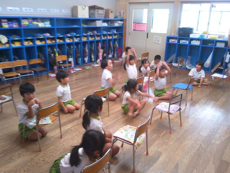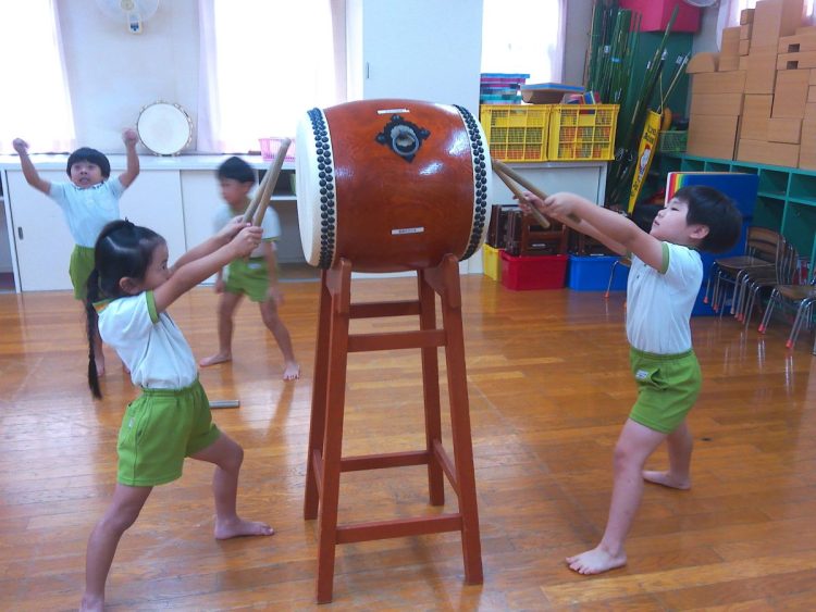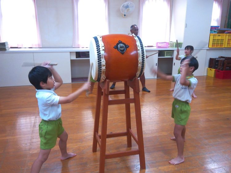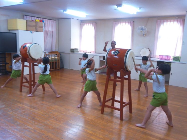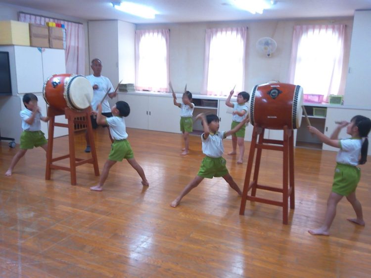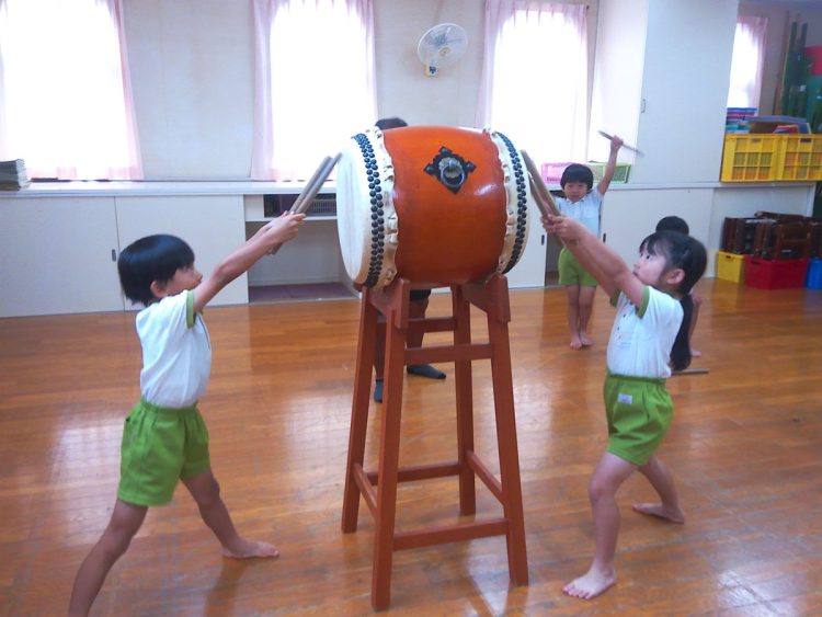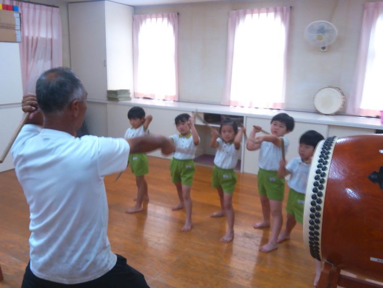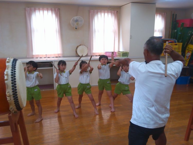 昨日、年長さんが「太鼓(宮太鼓)の練習」をしていました。教室では椅子を太鼓に見立てて練習していました。